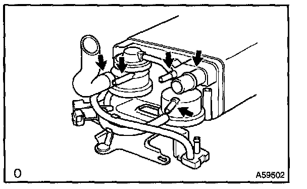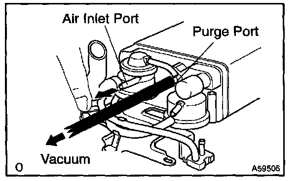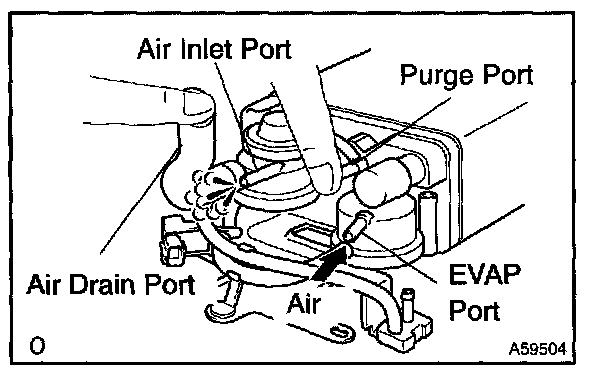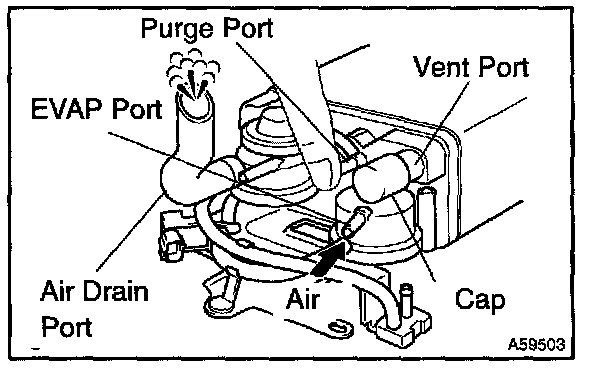 5. While holding the air inlet port closed, apply vacuum (3.43 kPa, 25.7 mmHg, 1.01 in.Hg) to the EVAP port and check that air flows into the purge port.
