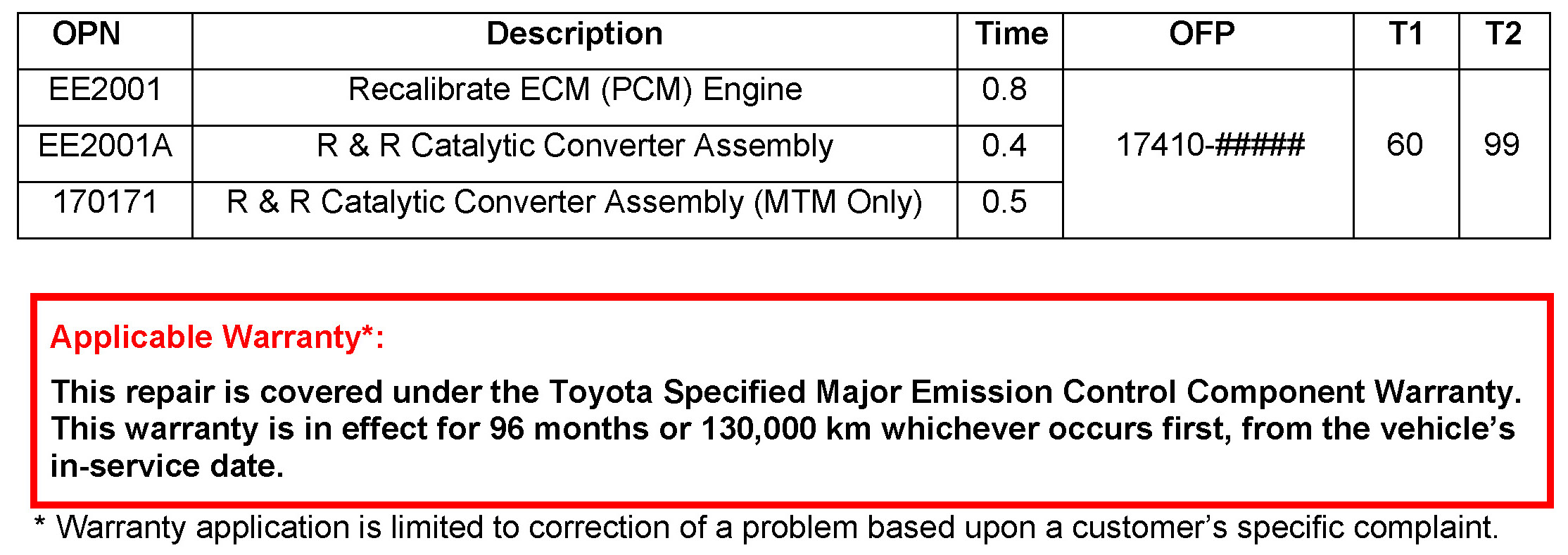 - April 26, 2005: The Op Code for "R & R Catalytic Converter Assembly (MTM Only)" has been updated in Warranty Information. Previous versions of this TSB should be discarded.