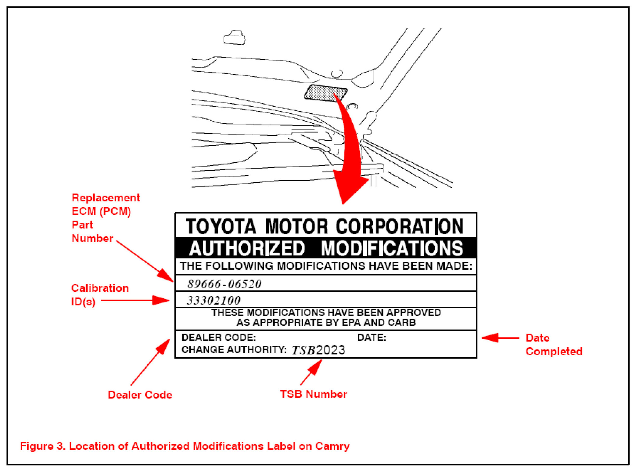 1. Check for the Authorized Modification Label affixed to the vehicle in the location shown in Figure 3. If there is no label present, proceed to step 2.