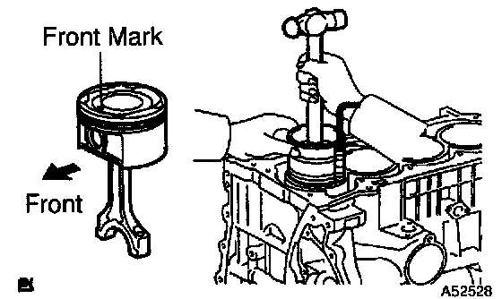 c. Using a piston ring compressor, push the correctly numbered piston and connecting rod assemblies into each cylinder with the front mark of the piston facing forward.