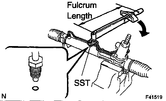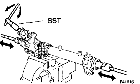^ Using SST, hold the power steering rack and install the steering rack end sub-assy.