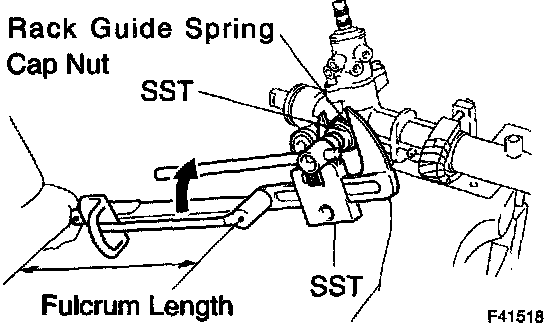 i. Using SST, hold the rack guide spring cap and using another SST, torque the rack guide spring cap nut.