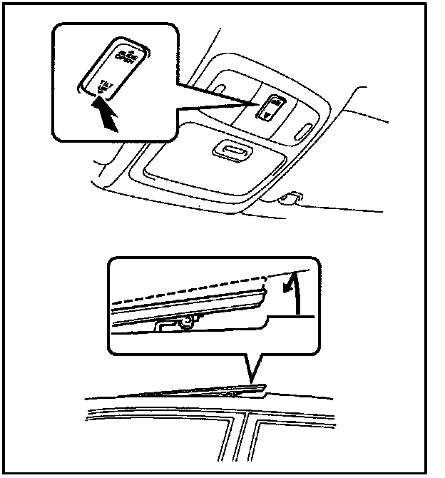 1. Push and hold down the "TILT UP" side of the switch until the moon roof tilts all the way up and then tilts down slightly (approx. 10 mm [0.39 in.] at the rear).
