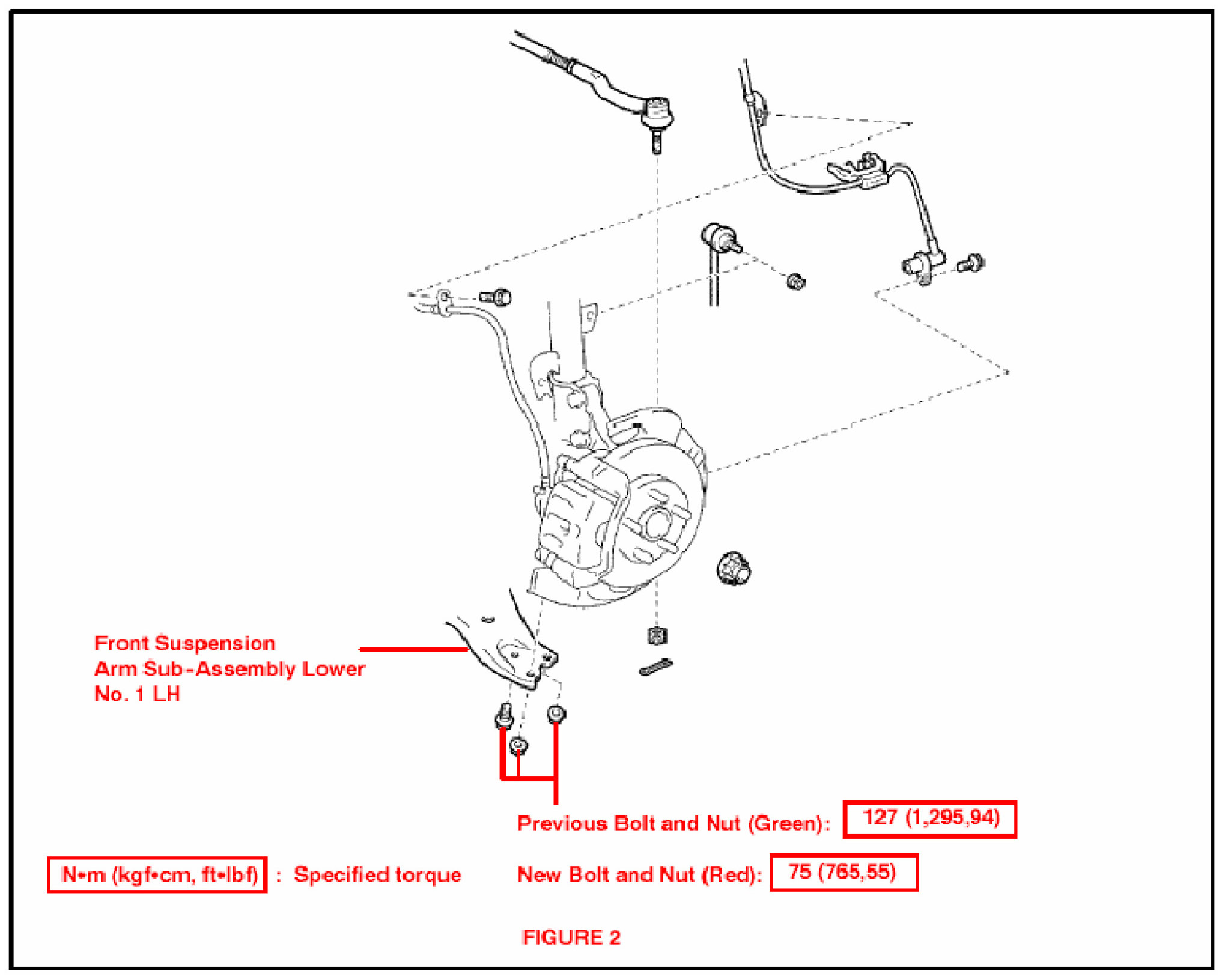 Front Suspension Arm Sub-- Assembly Lower No. 1 LH and bolt torque specification are shown in Figure 2 for reference. Information applies to both LH and RH parts.