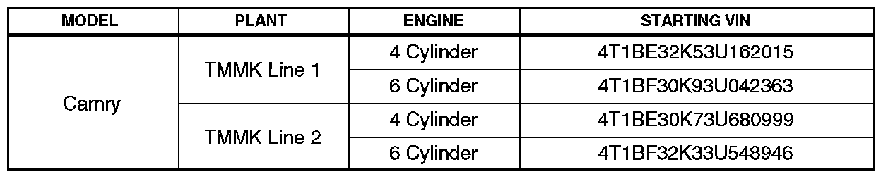 ^ 2002 - 2003 model year Camry (TMMK) vehicles produced before the VINs shown below.
