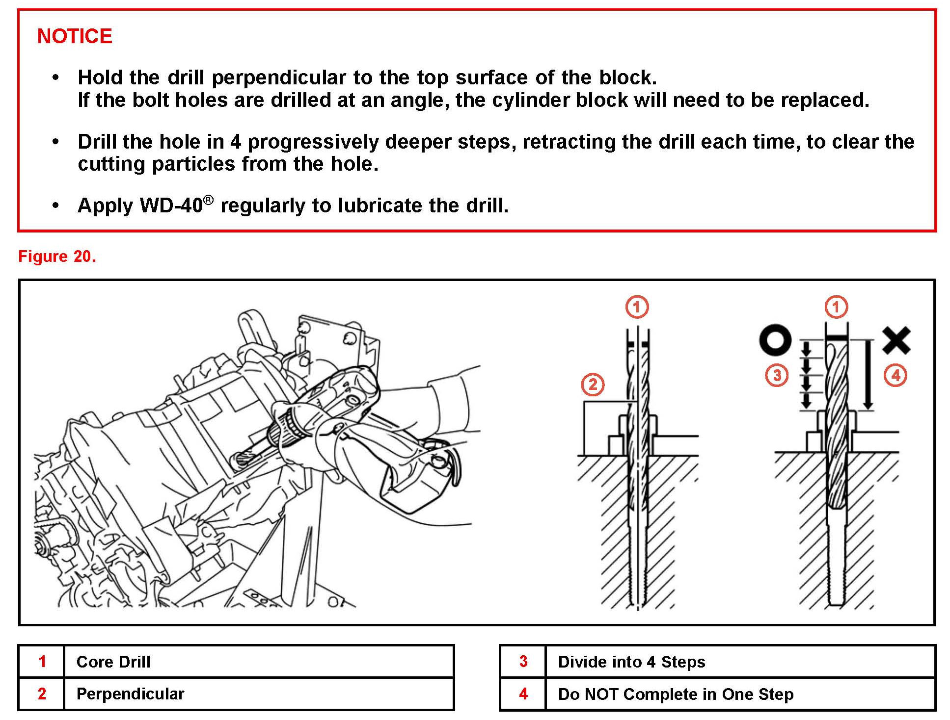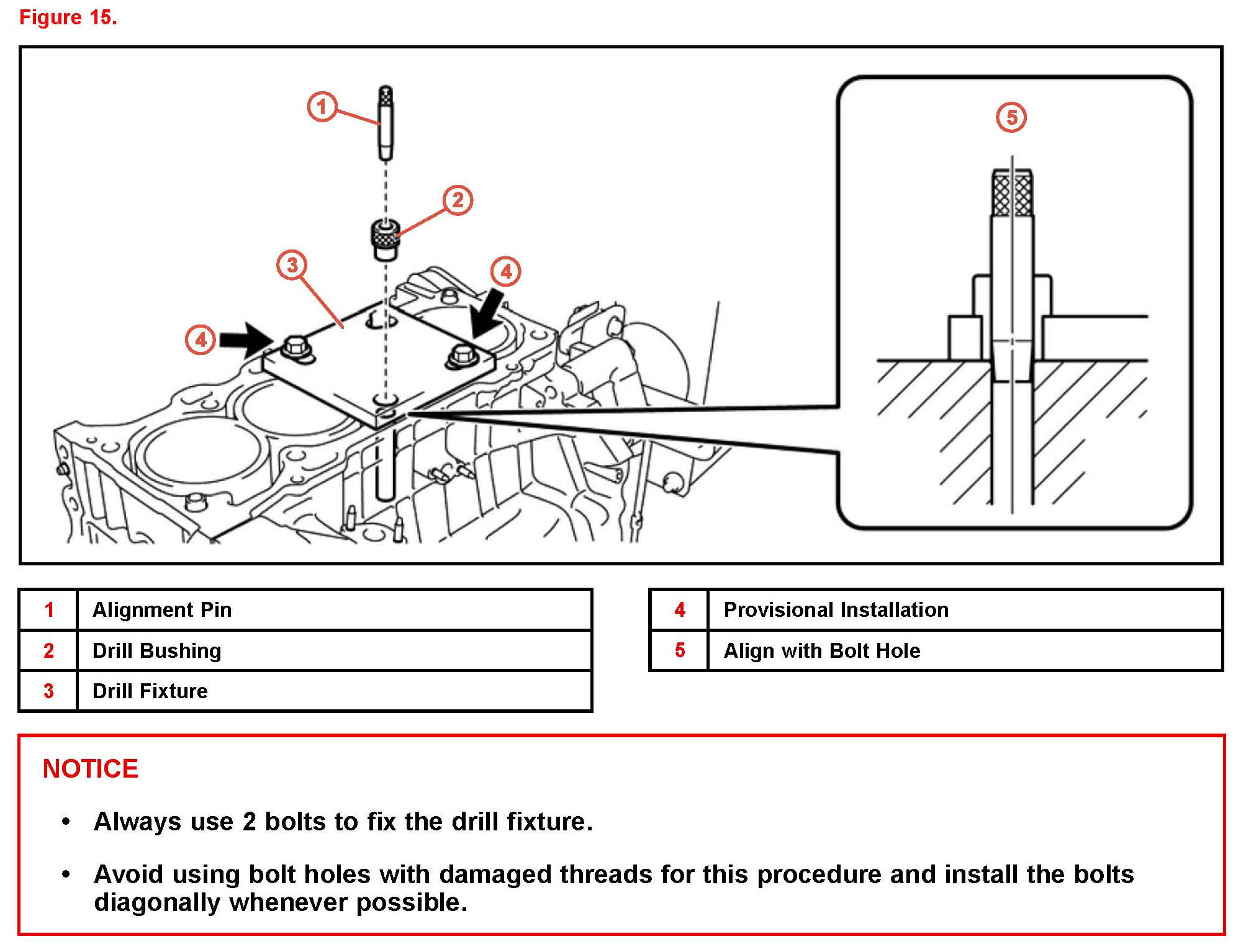 If the drill fixture is NOT correctly centered, the bolt holes may be drilled at an angle, and the cylinder block will need to be replaced.