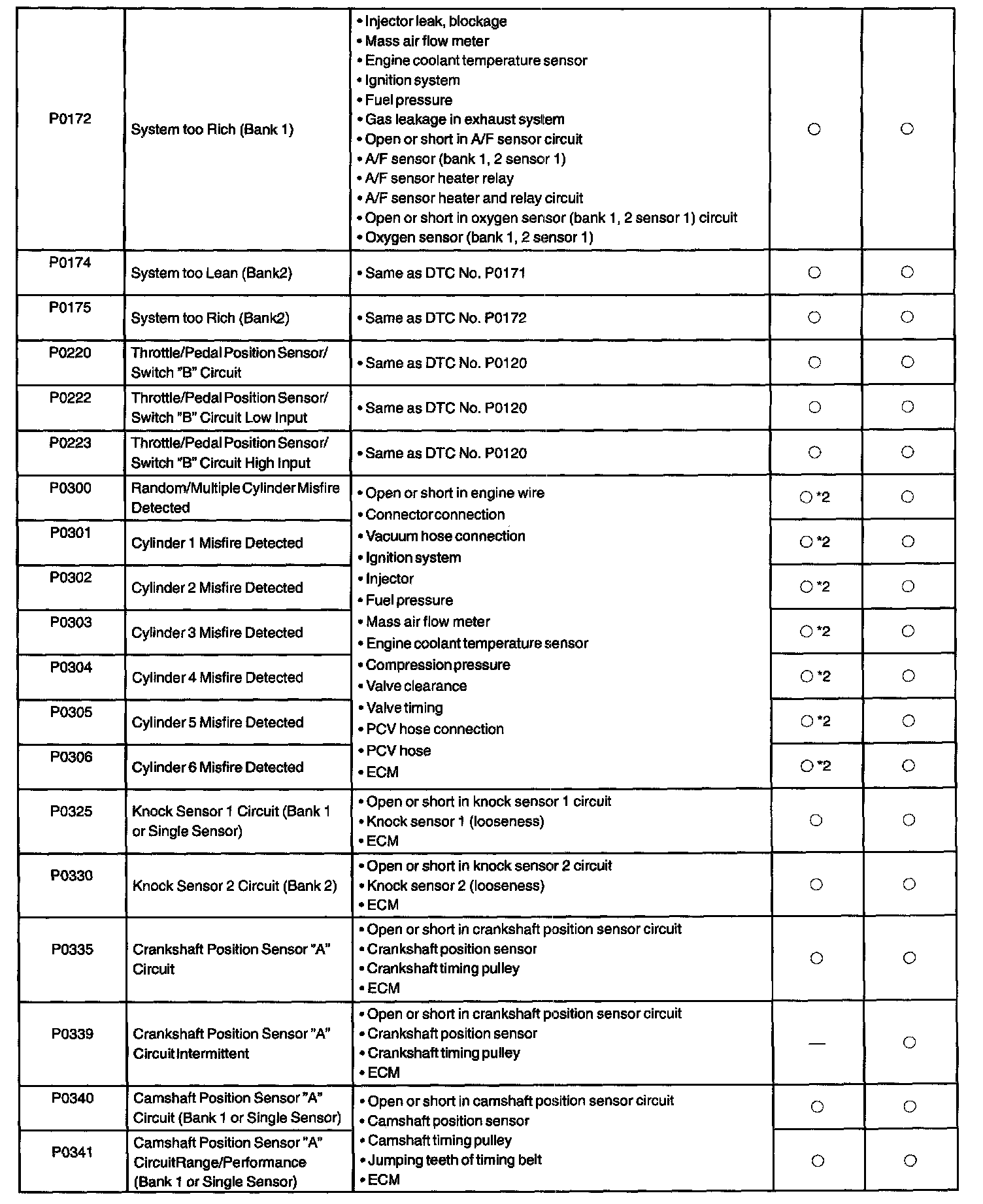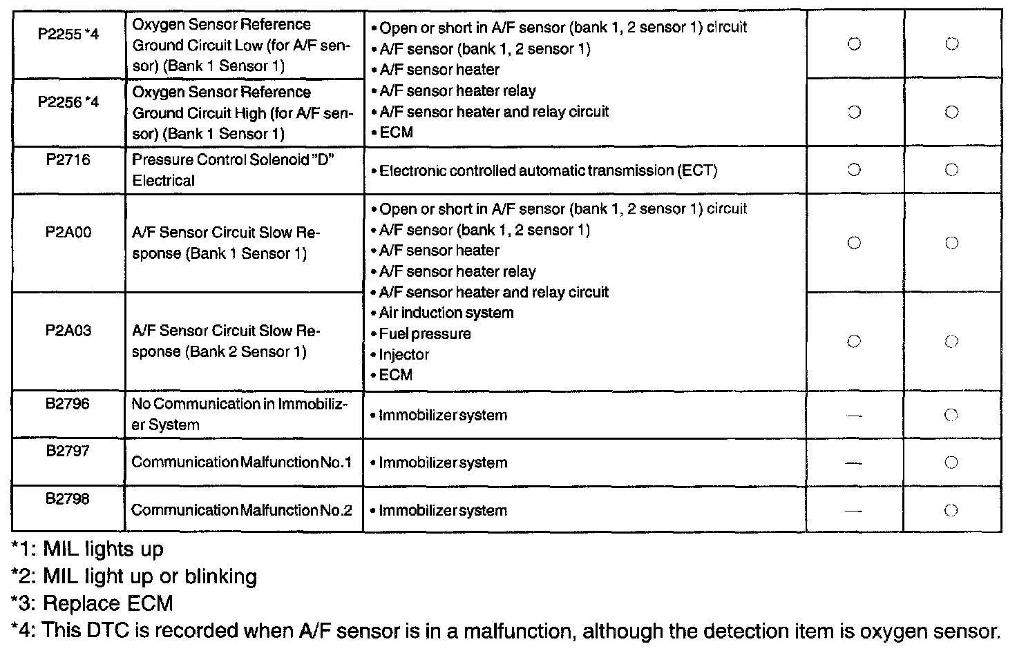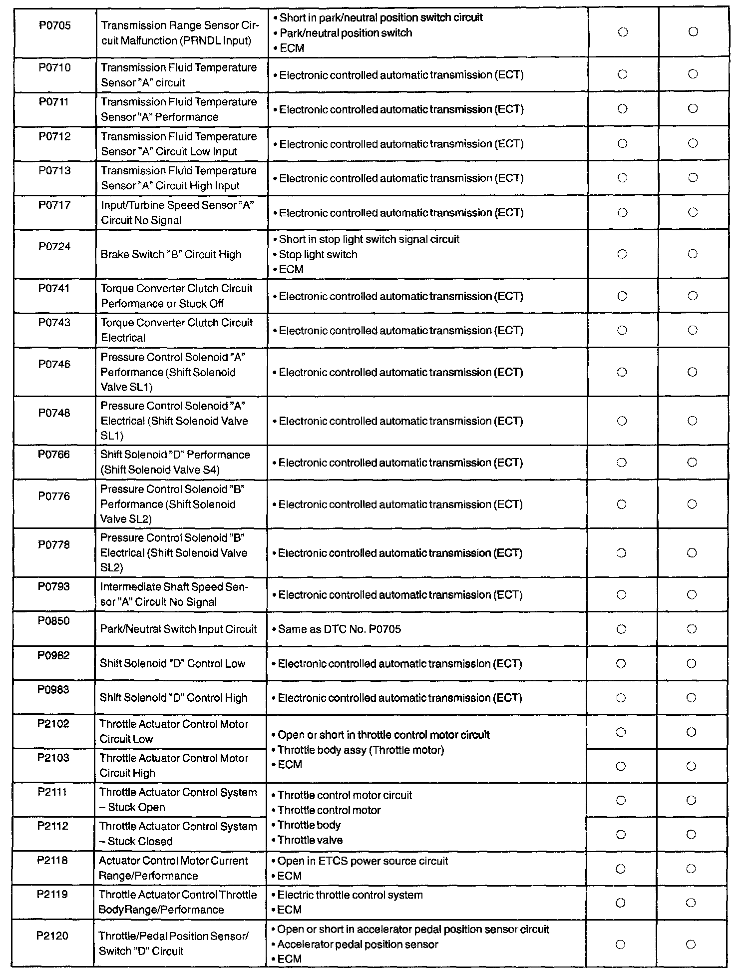 If a malfunction code is displayed during the DTC check in check mode, check the circuit for the codes listed in the table. For details of each code, turn to the respective "DTC No." in the DTC chart.