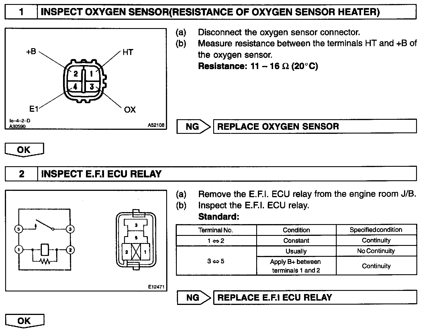 The ECM judges by the electromotive force from the oxygen sensor whether the air-fuel ratio is RICH or LEAN and controls the injection time accordingly. However, if malfunction of the oxygen sensor causes output of abnormal electromotive force, the ECM is unable to perform accurate air-fuel ratio control. The oxygen sensors include a heater which heats the zirconia element. The heater is controlled by the ECM. When the intake air volume is low (the temperature of the exhaust gas is low) current flows to the heater to heat the sensor for accurate oxygen concentration detection.