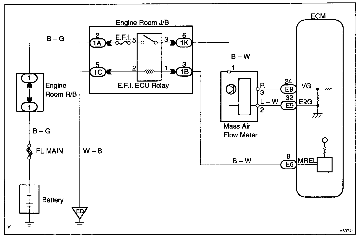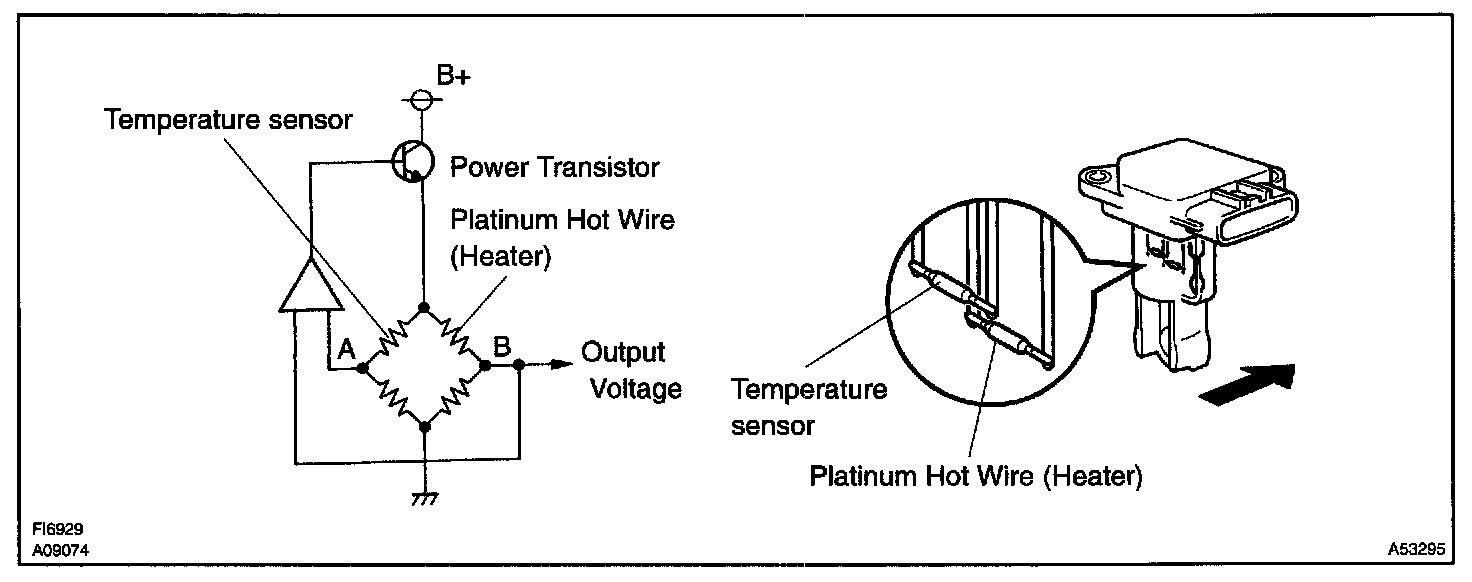 The mass air flow meter uses a platinum hot wire. The hot wire air flow meter consists of a platinum hot wire, temperature sensor and a control circuit installed in a plastic housing. The hot wire air flow meter works on the principle that the hot wire and temperature sensor located in the intake air bypass of the housing detect any changes in the intake air temperature.