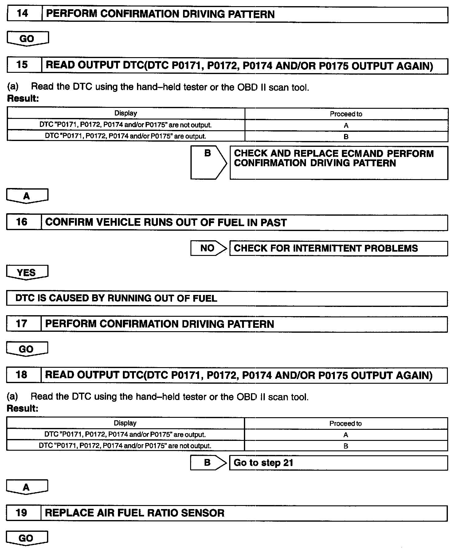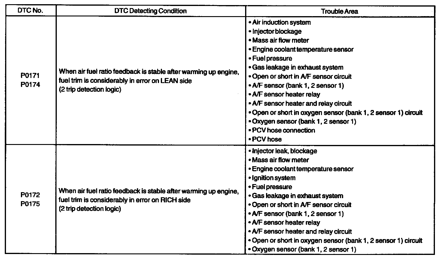 - When the DTC P0171 or P0174 is recorded, the actual air-fuel ratio is on the lean side. When DTC P0172 or P0175 is recorded, the actual air-fuel ratio is on the rich side.