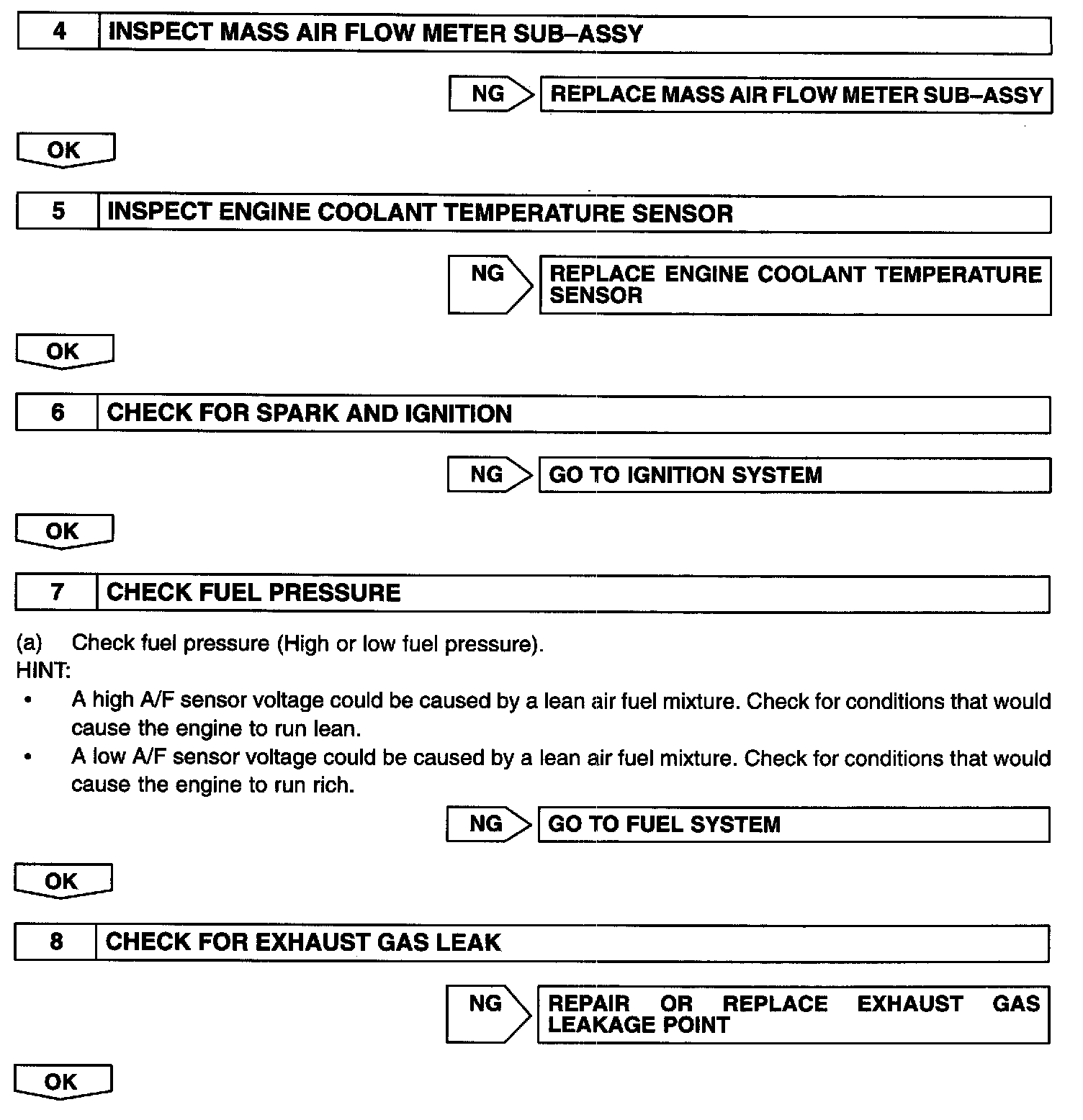 HINT: Read freeze frame data using the hand-held tester or the OBD II scan tool, as freeze frame data records the engine conditions when a malfunction is detected. When troubleshooting, it is useful for determining whether the vehicle was running or stopped, the engine was warmed up or not, the air-fuel ratio was lean or rich, etc. at the time of the malfunction.