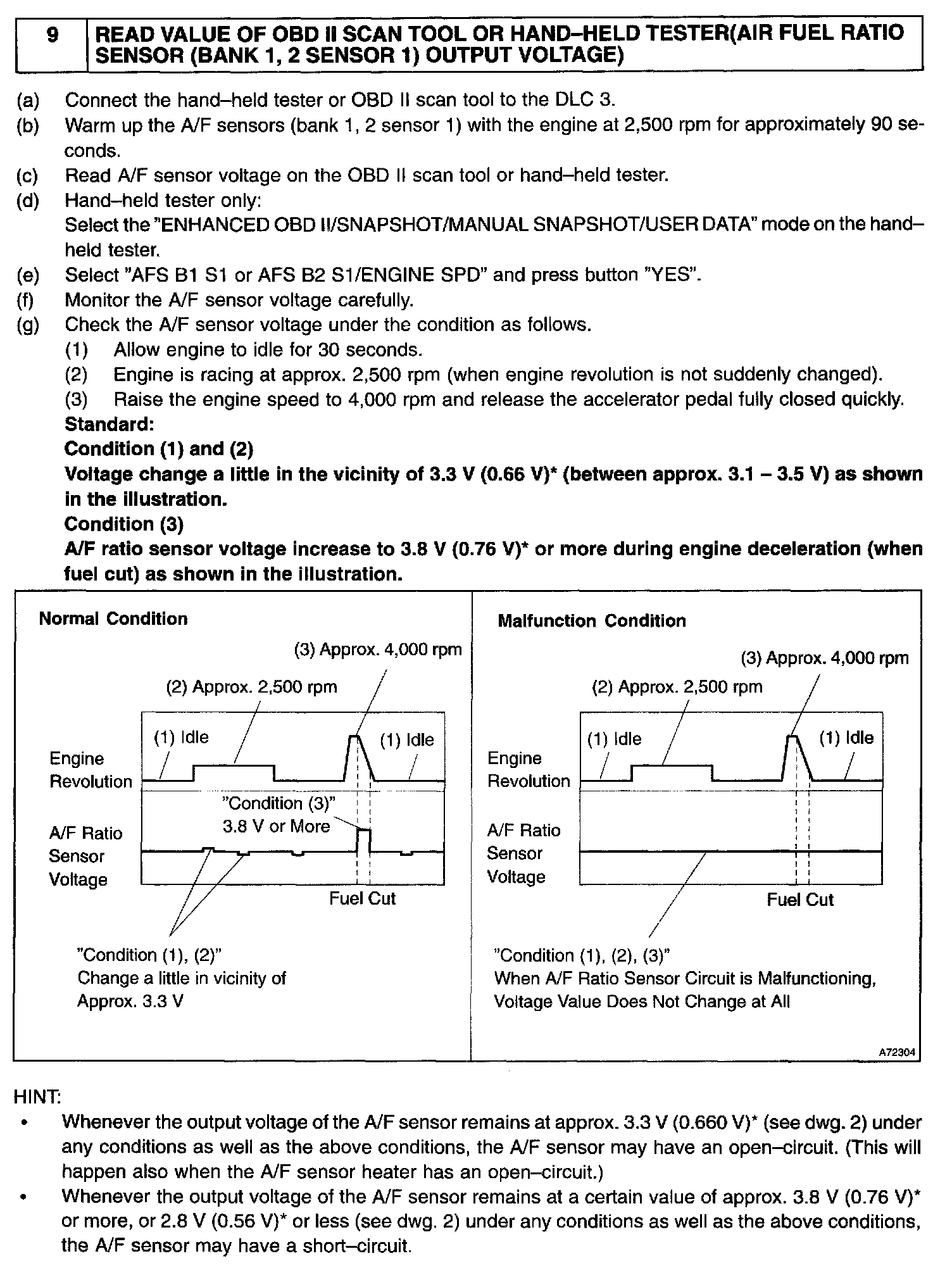 - The A/F sensors (bank 1, 2 sensor 1) output voltage and the short-term fuel trim value can be read using the OBD II scan tool or the hand-held tester.
