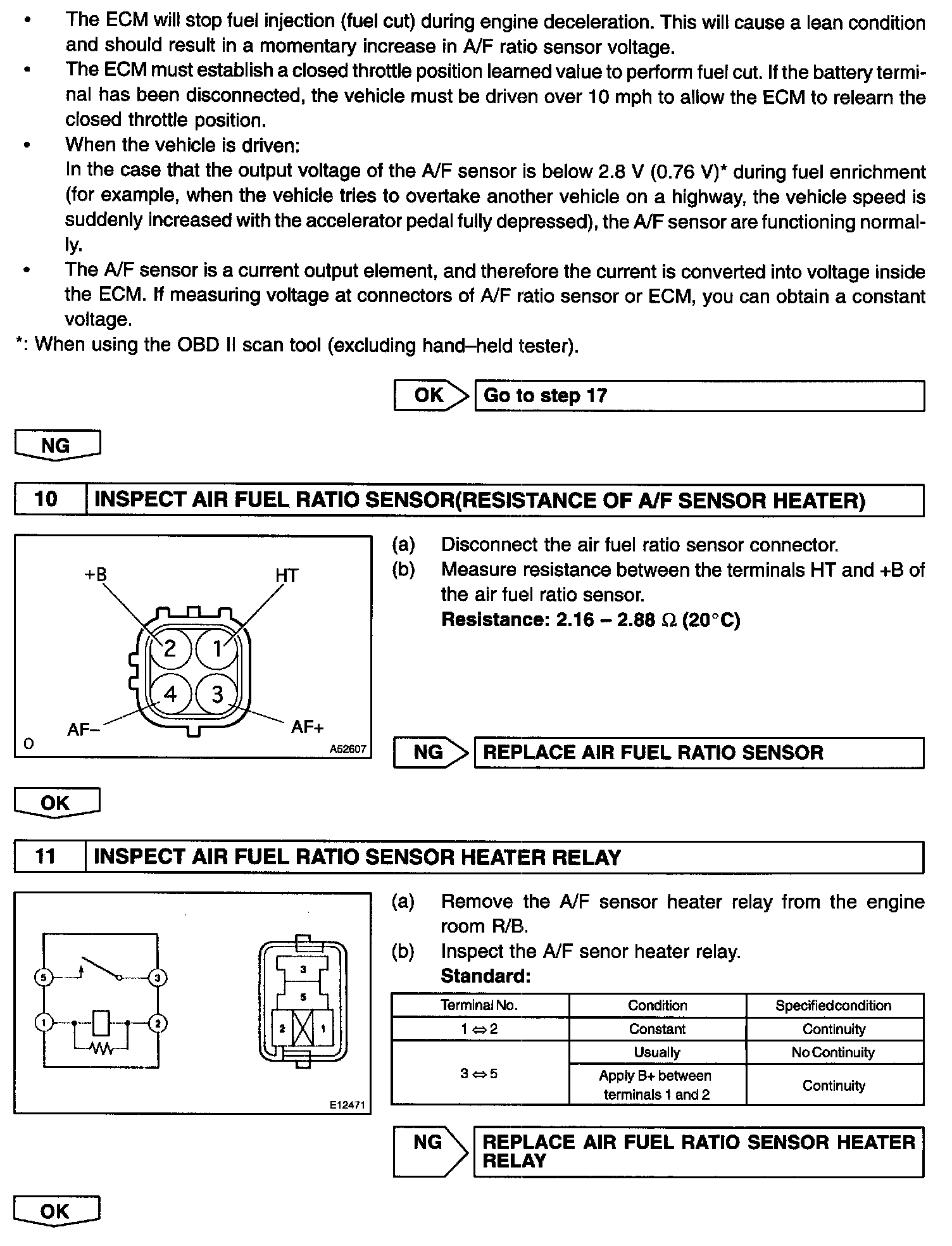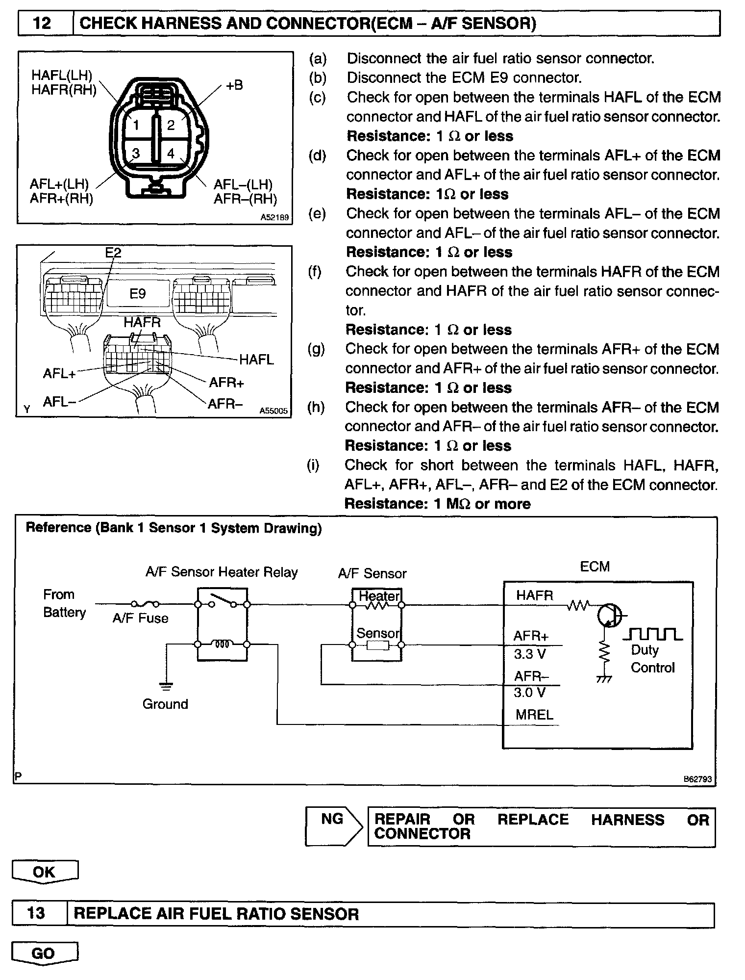 - The ECM controls the voltage of AFR+, AFL+, AFR- and AFL- terminals of ECM to the fixed voltage. Therefore, it is impossible to confirm the A/F sensor output voltage without OBD II scan tool or hand-held tester.