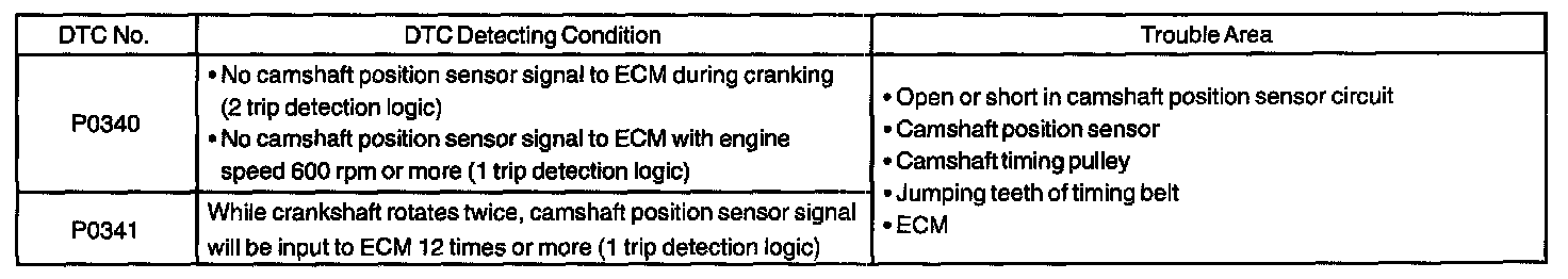 - DTC P0341 indicate a malfunction related to the camshaft position sensor (-) circuit. (Wire harness (ECM - camshaft position sensor) and camshaft position sensor)