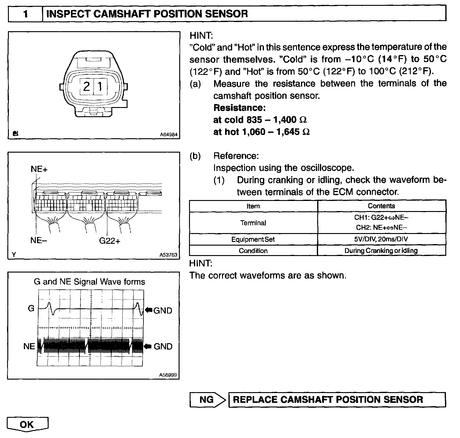 The camshaft position sensor (G22 signal) consists of a magnet, iron core and pickup coil, and is mounted onto the exhaust side of the cylinder head. The timing rotor is integrated with the left bank exhaust camshaft. Each time when the camshaft rotates, the air gap between the camshaft position sensor and the protrusion integrated onto the camshaft is varied. This causes the magnetic flux passing through the pickup coil to increase and decrease, generating an electromotive force. Since the voltage is generated when the camshaft protrusion approaches the pickup coil and when it departs, and alternating electrical current is produced. The NE signal plate has 34 teeth and is mounted on the crankshaft. The NE signal sensor generates 34 signals at every engine revolution. The engine ECM detects the crankshaft angle and the engine speed based on the NE signals, and the cylinder detection based on the combination of the G22 and NE signals.