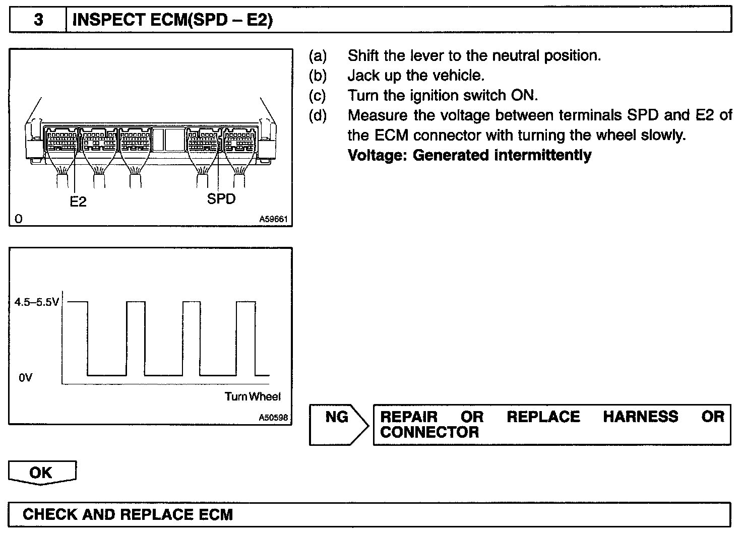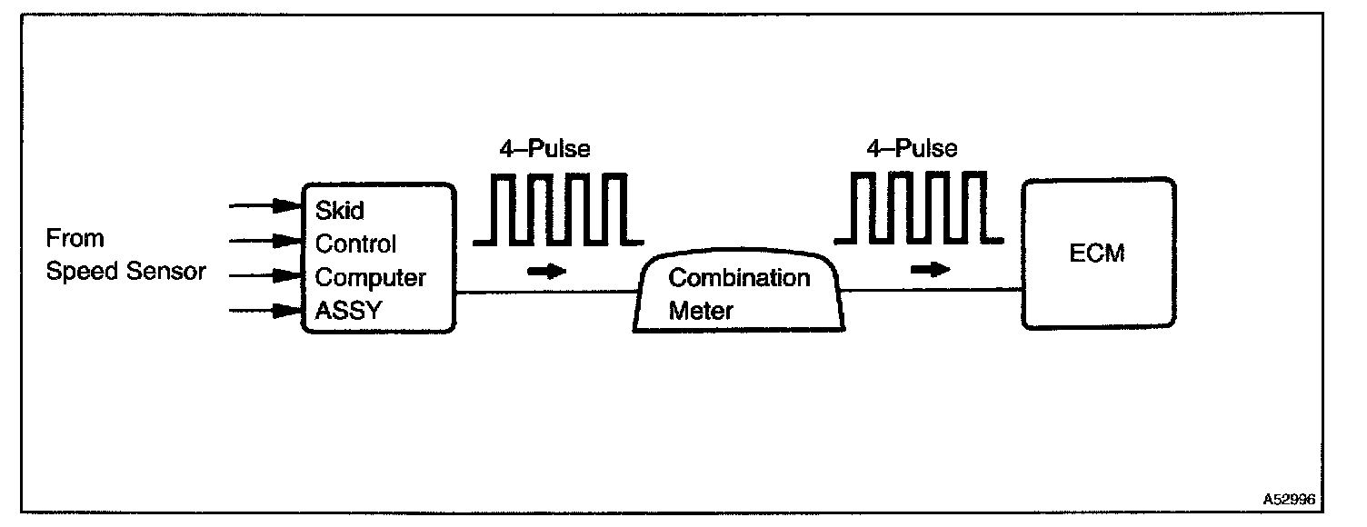 The ECM converts these signals into a 4-pulse signal and outputs it to the combination meter. After this signal is converted into a more precise rectangular waveform by the waveform shaping circuit inside the combination meter, it is then transmitted to the ECM. The ECM determines the vehicle speed based on the frequency of these pulse signals.