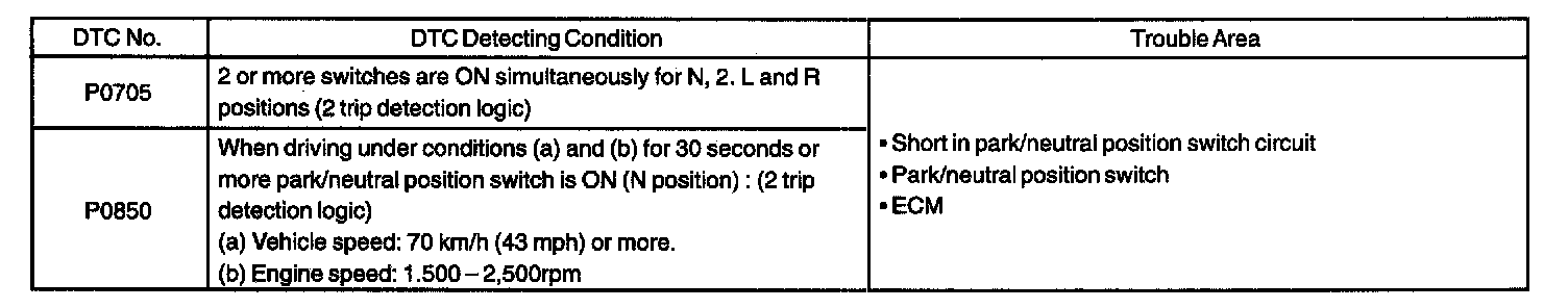 HINT: After confirming DTC P0705 and P0850 use the hand-held tester to confirm the park/neutral position switch signal from the "DIAGNOSIS/ENHANCED OBD II/DATA LIST/ALL DATA".
