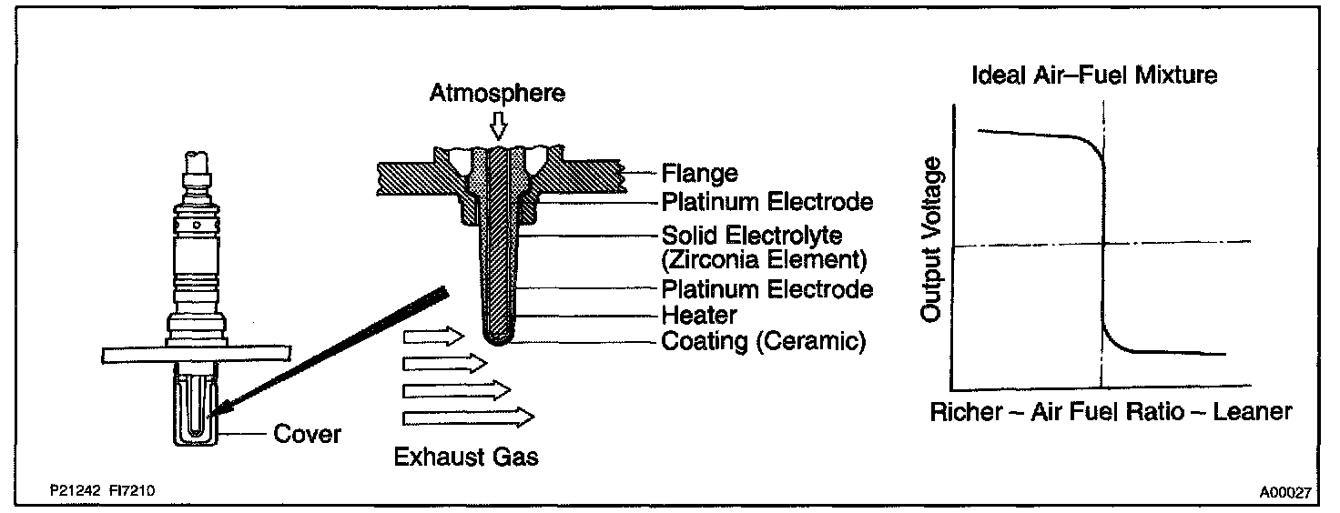 The oxygen sensor has the characteristic whereby its output voltage changes suddenly in the vicinity of the stoichiometric air-fuel ratio. This is used to detect the oxygen concentration in the exhaust gas and provide feedback to the computer for control of the air-fuel ratio.