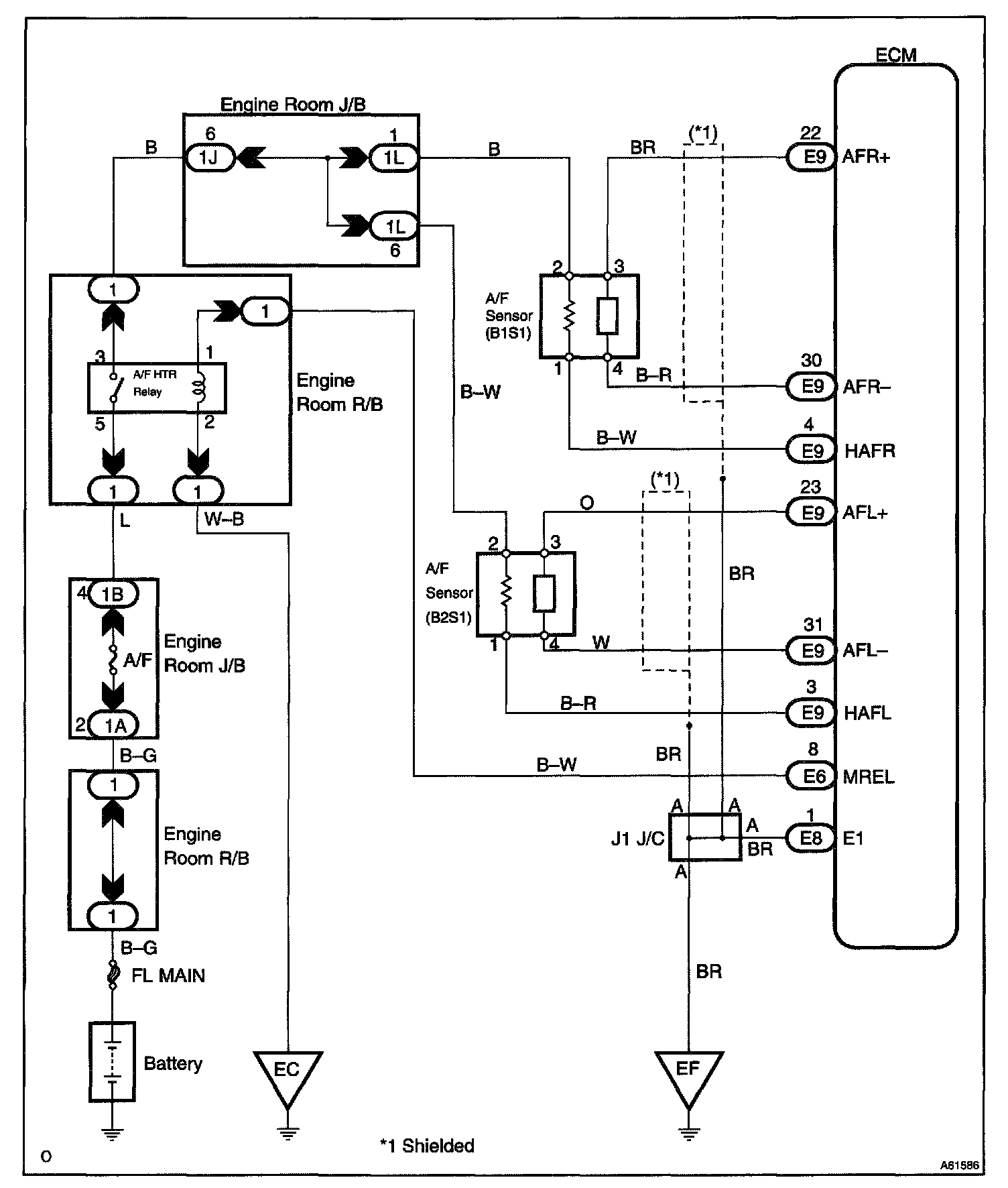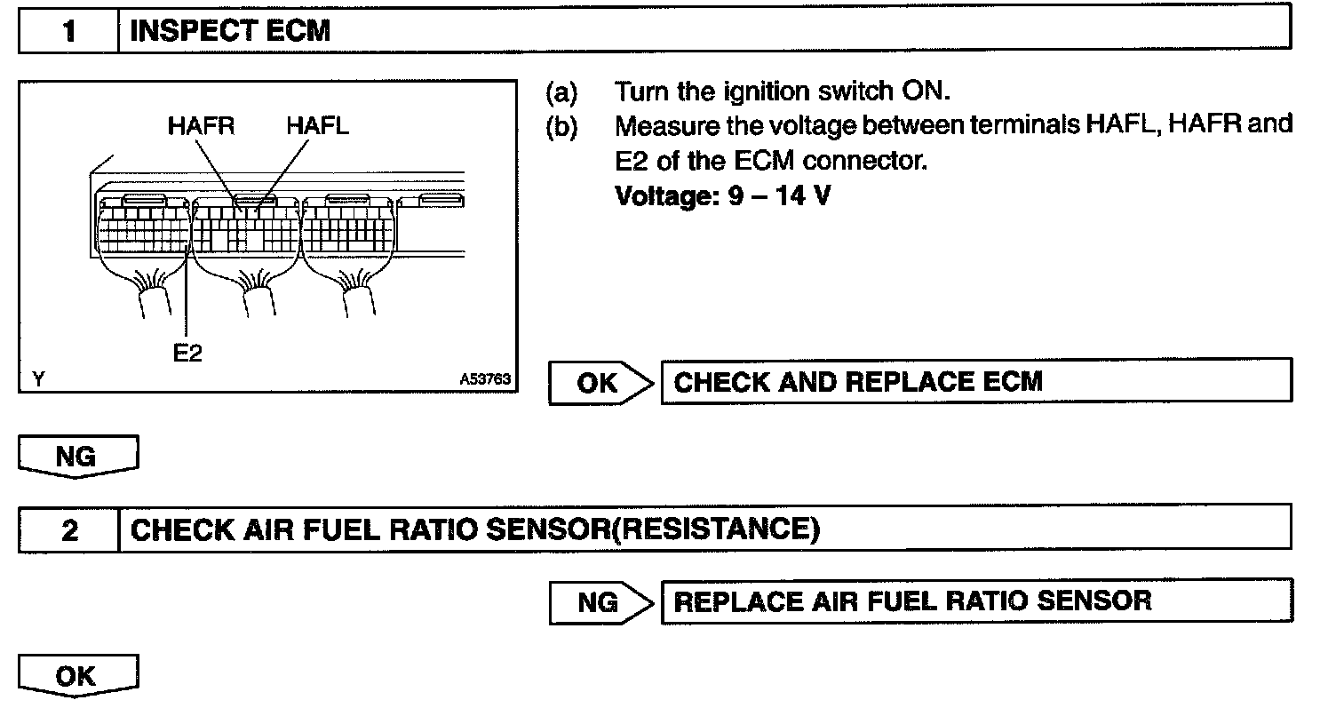 - The ECM controls the voltage of the AFR+, AFL+, AFR- and AFL- terminals of the ECM to the fixed voltage. Therefore, it is impossible to confirm the A/F sensor output voltage without the OBD II scan tool or hand-held tester.