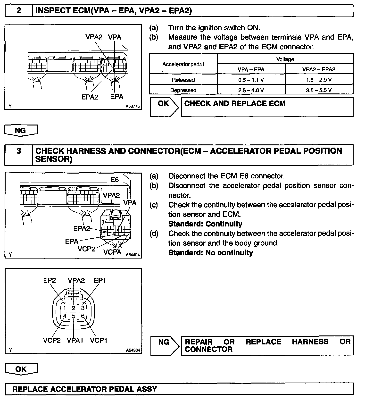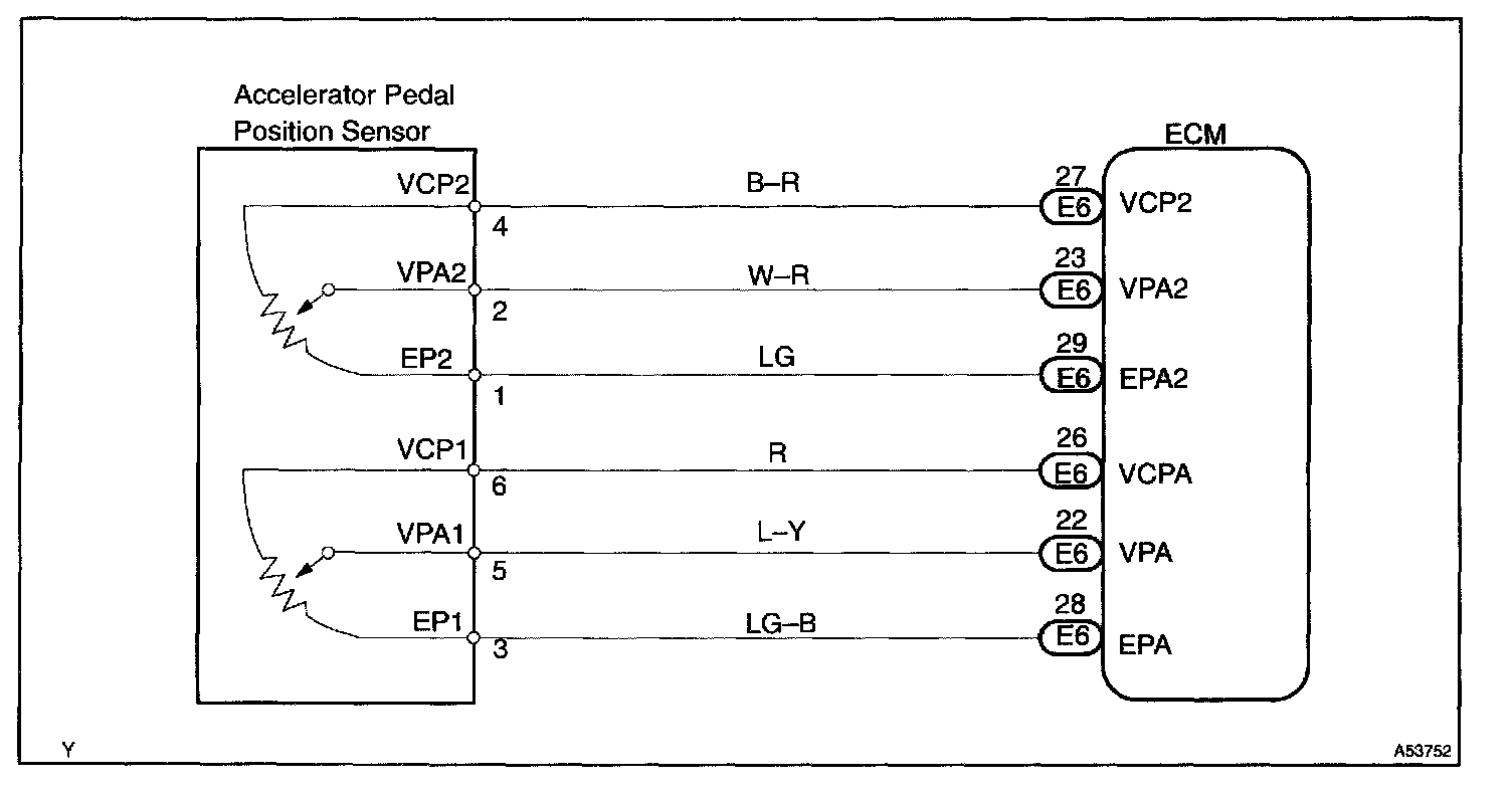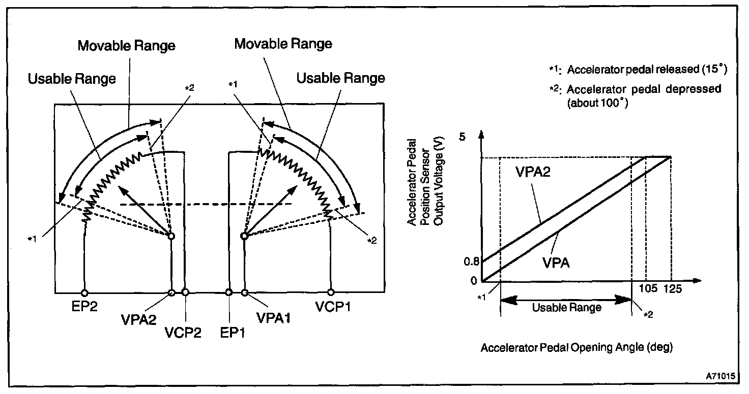 In the accelerator pedal position sensor, the voltage applied to pedal terminals VPA1 and VPA2 of the ECM changes between 0 V and 5 V in proportion to the opening angle of the accelerator pedal. The VPA1 is a signal to indicate the actual accelerator pedal opening angle which is used for the engine control, and the VPA2 is a signal to indicate the information about the opening angle which is used for detecting a malfunction.