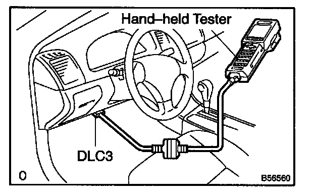 2. Connect the hand-held tester to the DLC3 under the instrument panel lower pad.