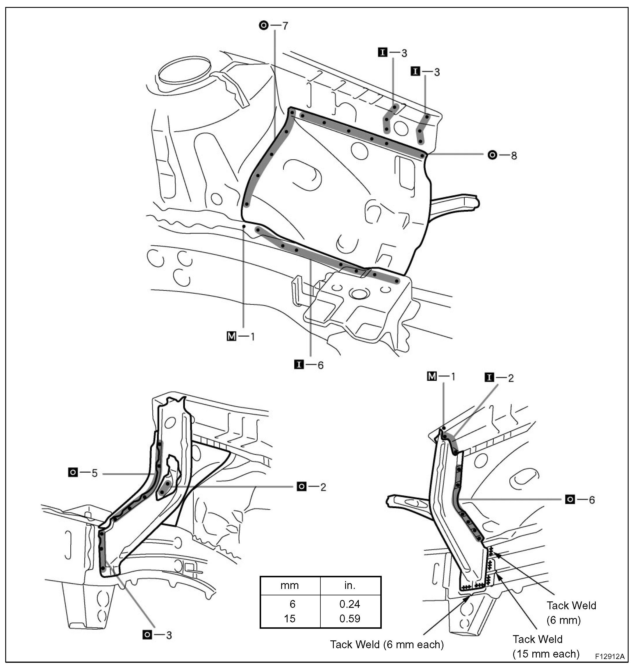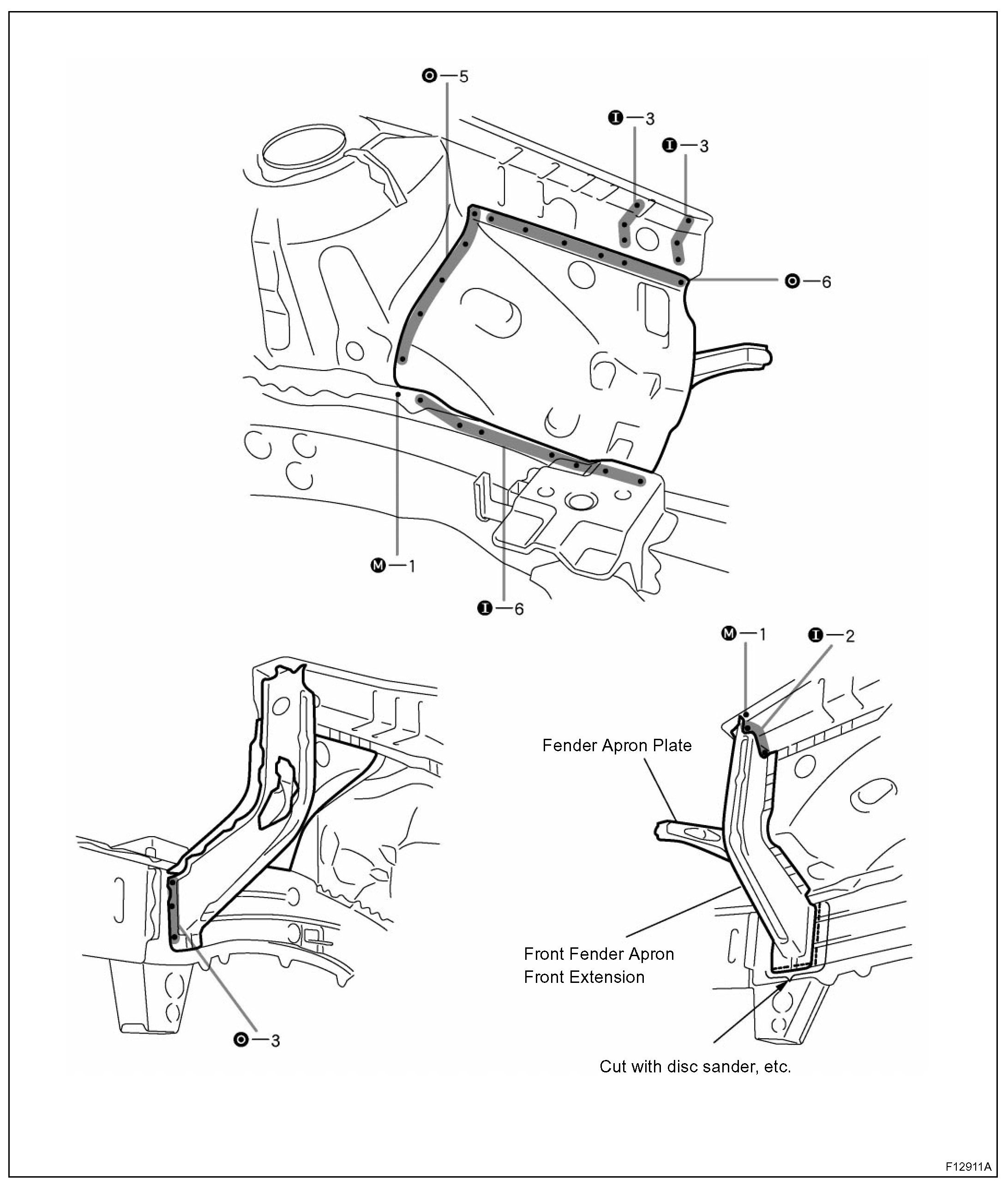 a. Replace the front fender apron front extension and fender apron plate at the same time.