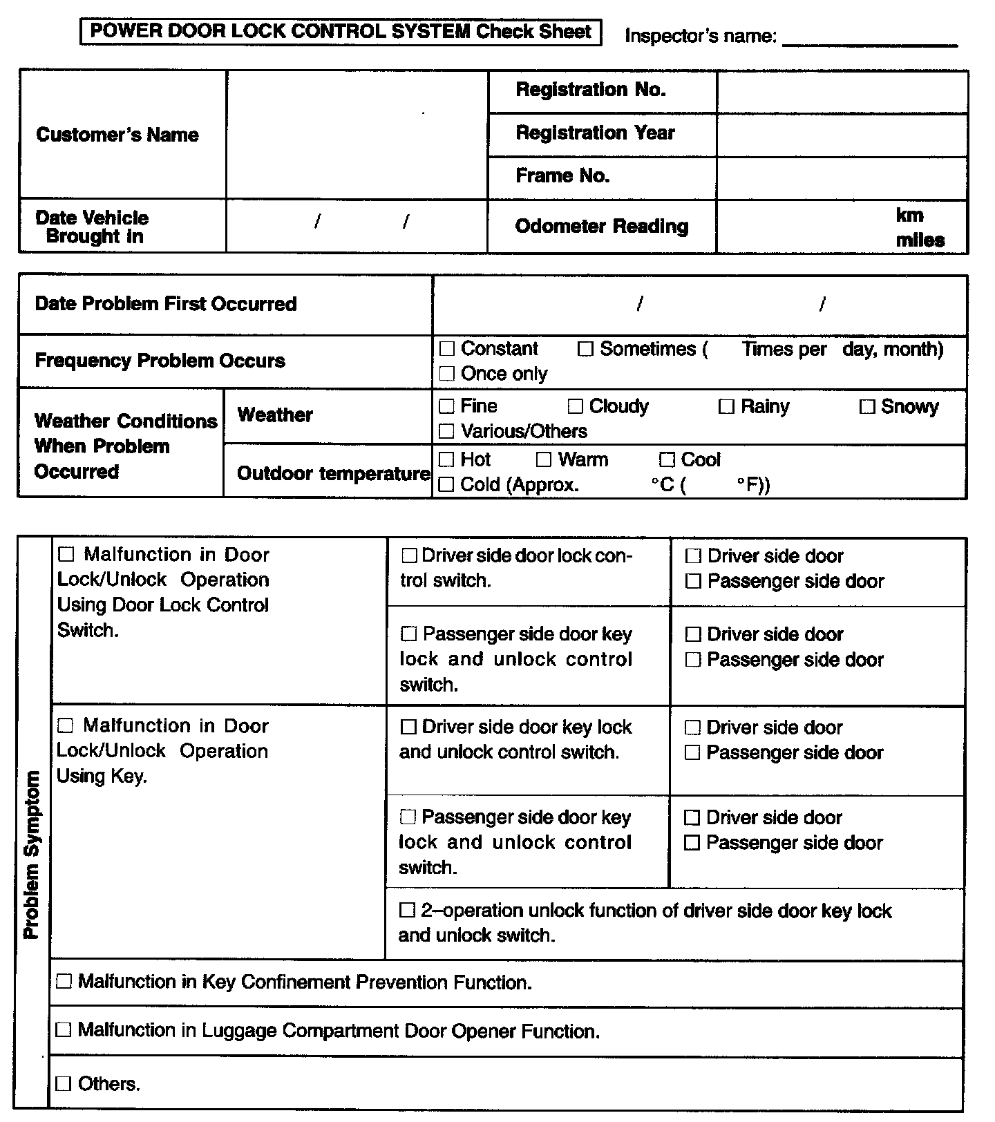Power Door Lock Control System Check Sheet: