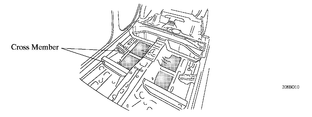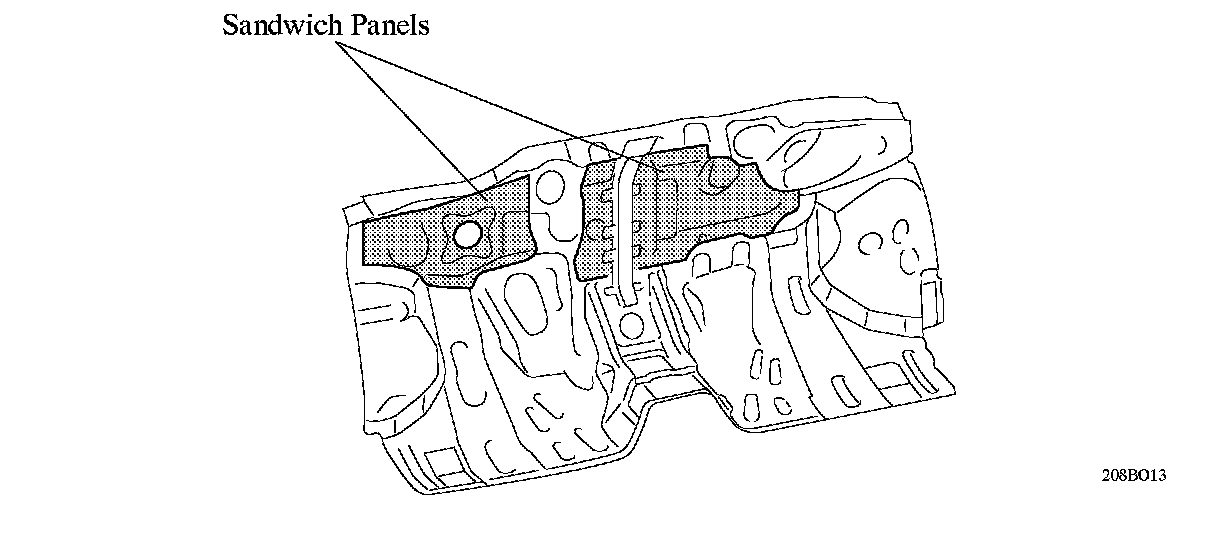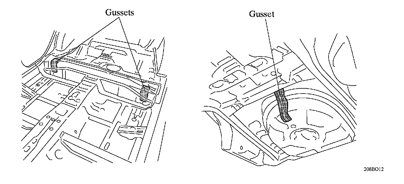 (d) Gussets have been added to the floor under reinforcement in order to restrain the vibration that is created by the difference in angles between the front floor and the center floor.