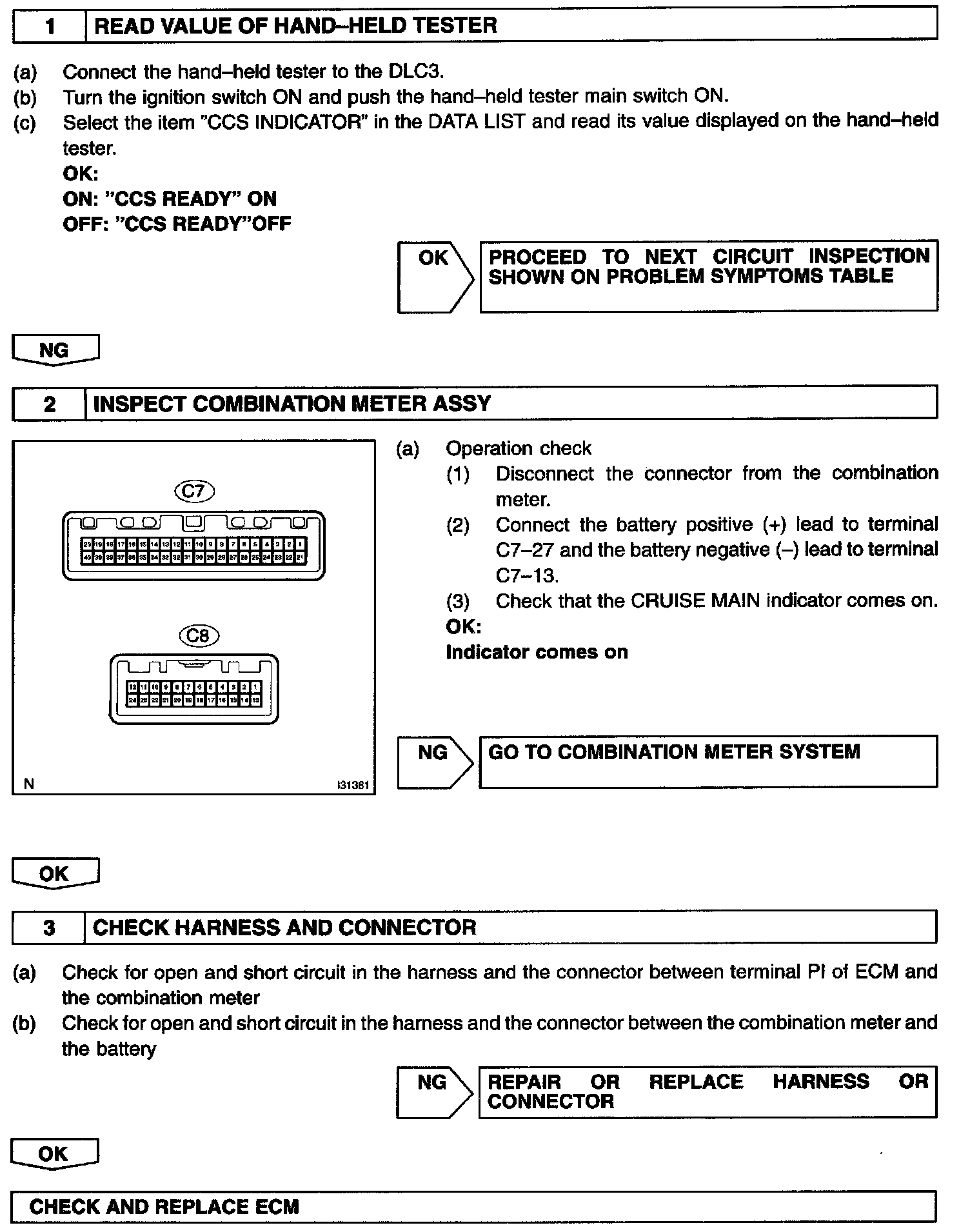 When the cruise control main switch is turned ON, CRUISE MAIN indicator light comes on.