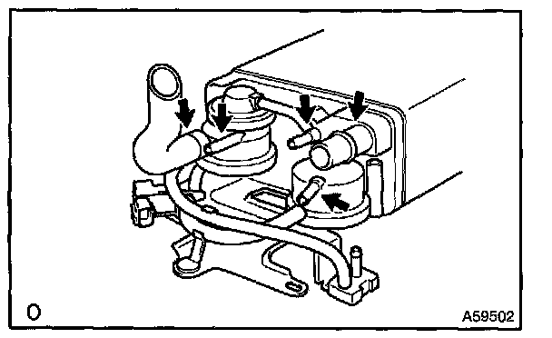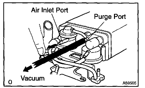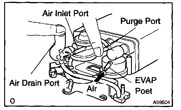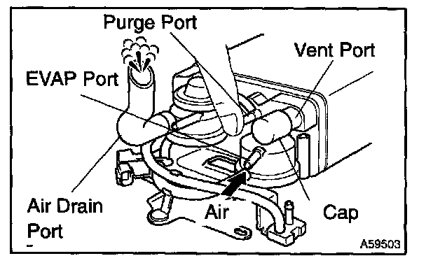 5. While holding the air inlet port closed, apply vacuum (3.43 kPa, 25.7 mmHg, 1.01 in.Hg) to the EVAP port and check that air flows into the purge port.