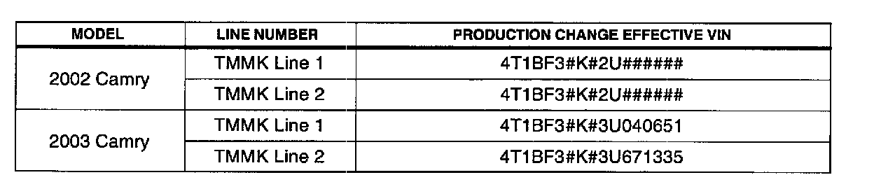 ^ 2002 - 2003 model year Camry (TMMK V6 Production) vehicles produced BEFORE the Production Change Effective VINs shown below.