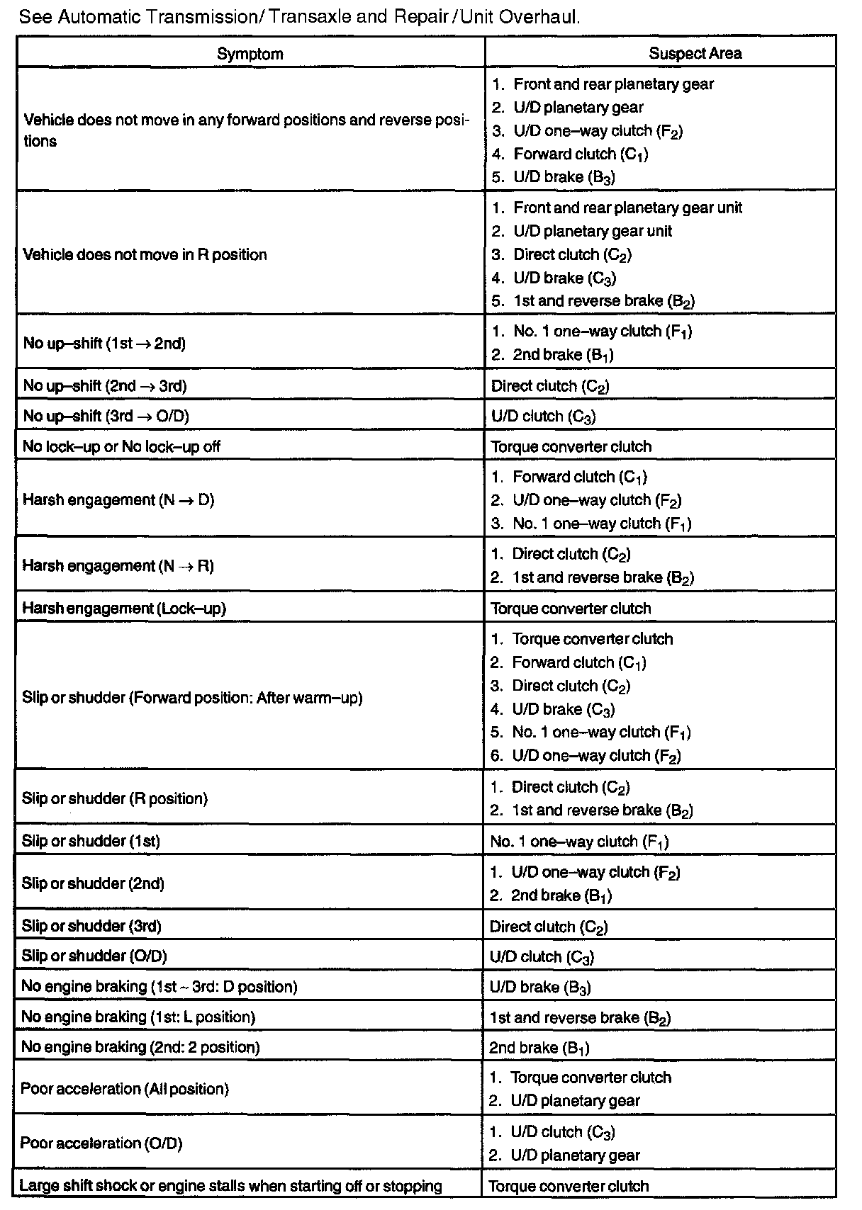 PROBLEM SYMPTOMS TABLEHINT: If a normal code is displayed during the diagnostic trouble code check although the trouble still occurs, check the circuits for each symptom in the order given in the charts and proceed to the troubleshooting.