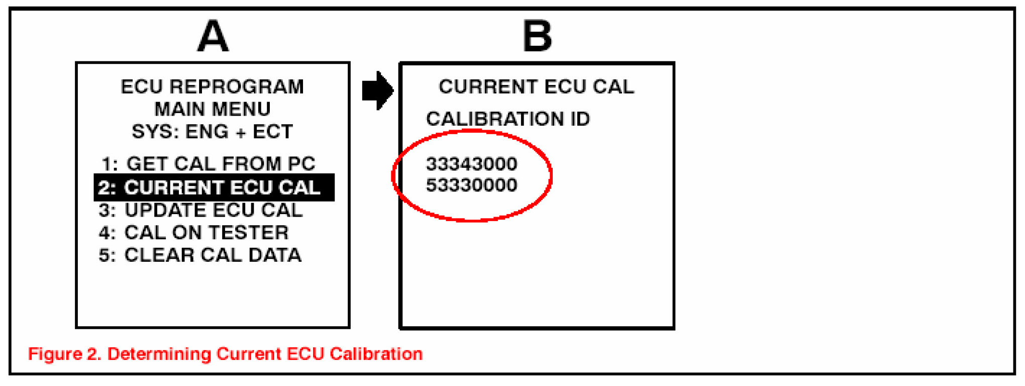 2. Connect the Diagnostic Tester to the vehicle and select CURRENT ECU CAL from the ECU REPROGRAM MAIN MENU. Determine the vehicle's current ECU calibration (see Figure 2).