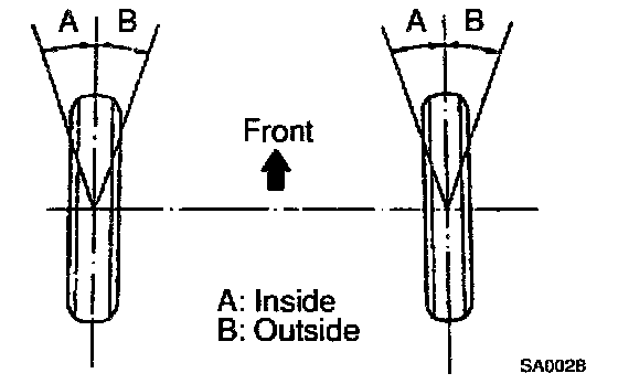 If the caster and steering axis inclination are not within the specified values, after the camber has been correctly adjusted, recheck the suspension parts for damaged and/or worn out parts.