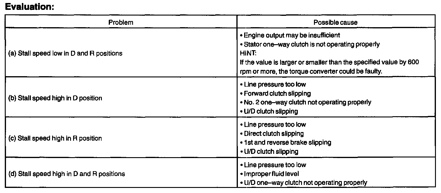 The object of this test is to check the overall performance of the transaxle and engine by measuring the stall speeds in the D and R positions.