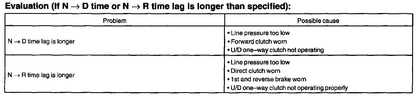 When the shift lever is shifted while the engine is idling, there will be a certain time lapse or lag before the shock can be felt. This is used for checking the conditions of the O/D direct clutch, forward clutch, and 1st and reverse brake.