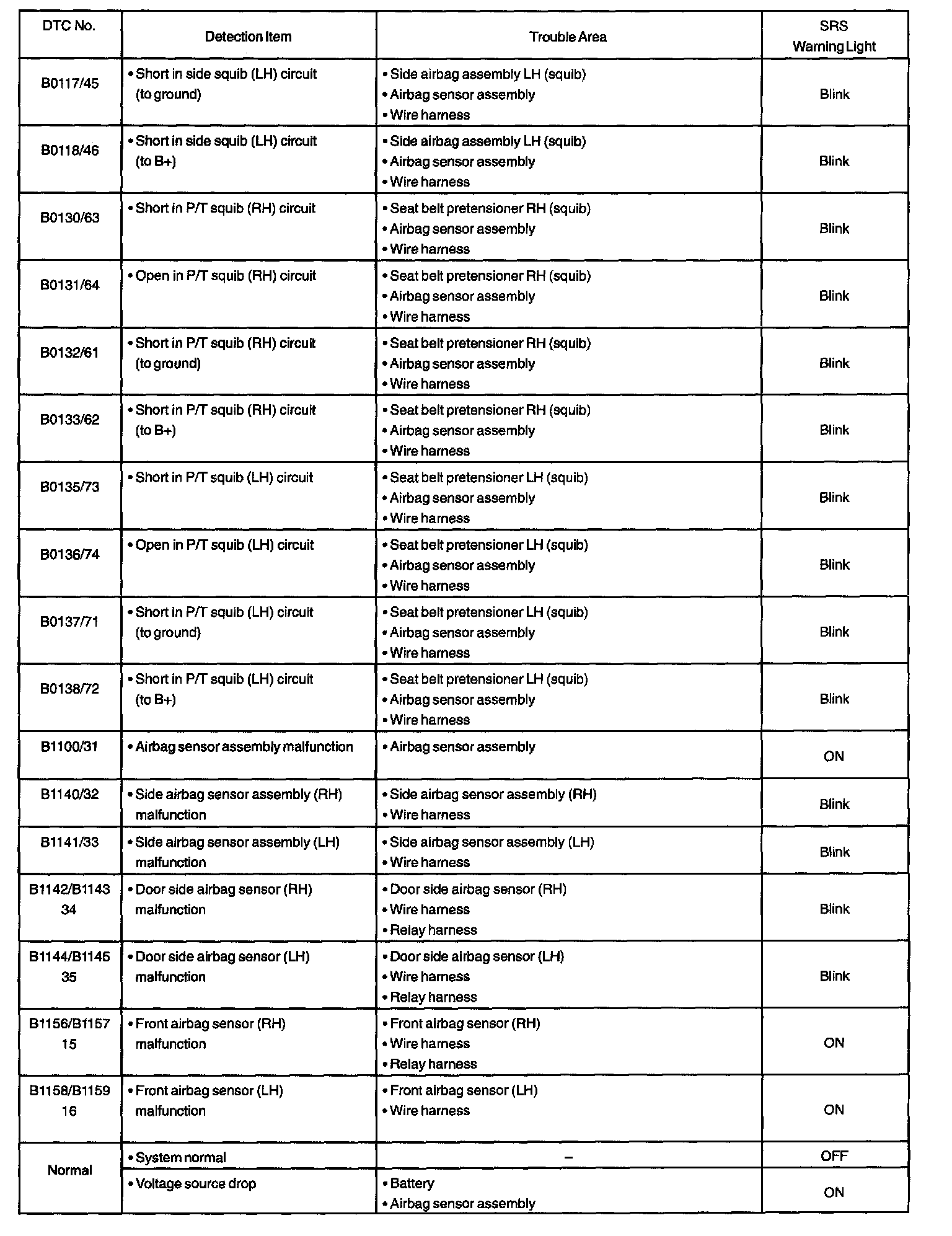 - When the SRS warning light remains lit up and the DTC is the normal code, this means a voltage source drops.