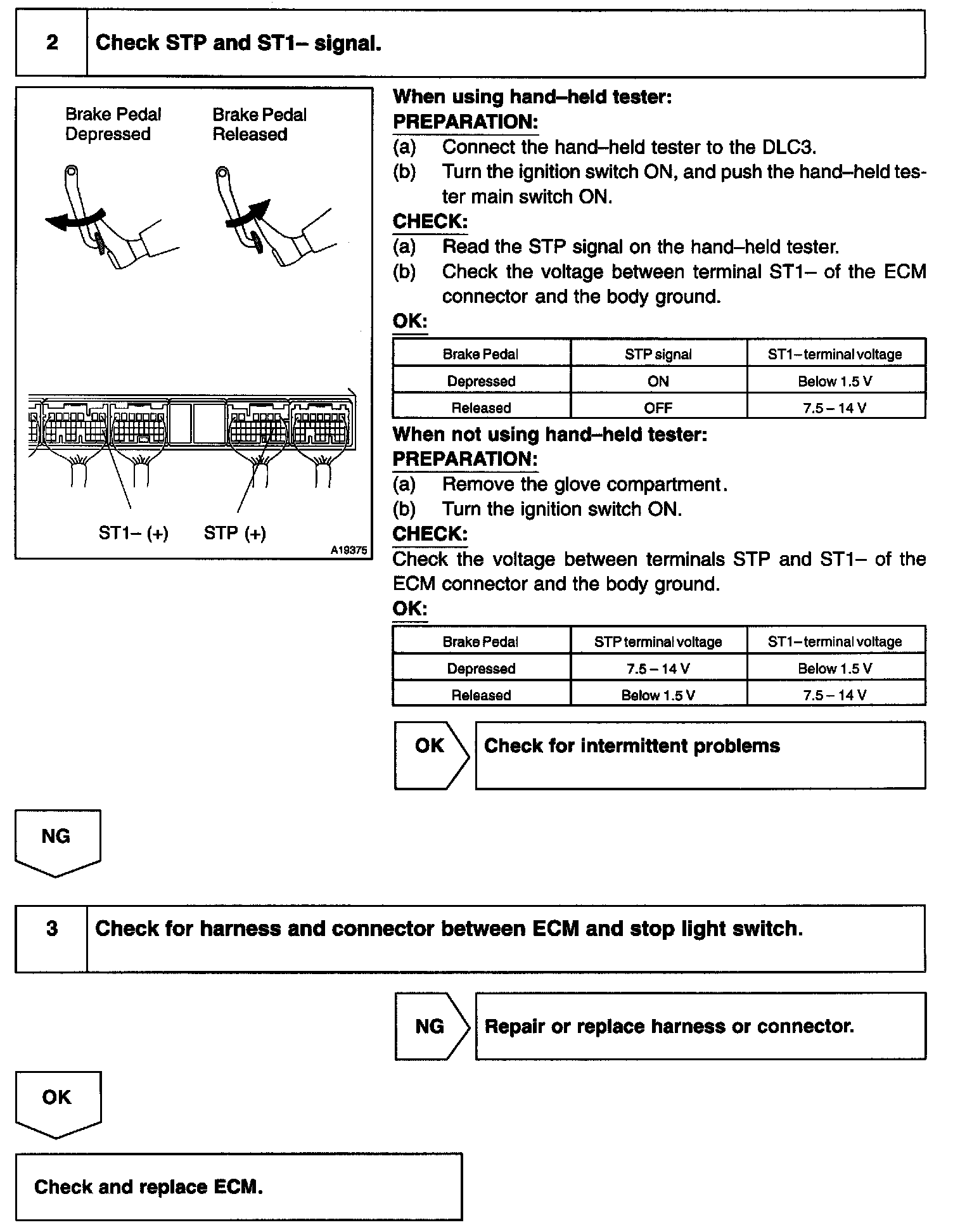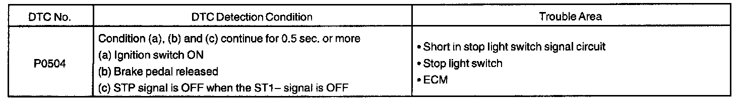 The stop light switch has a duplex system (signals STP and ST1-) to memorize the abnormality when the signals of depressing and releasing the brake pedal are detected simultaneously.