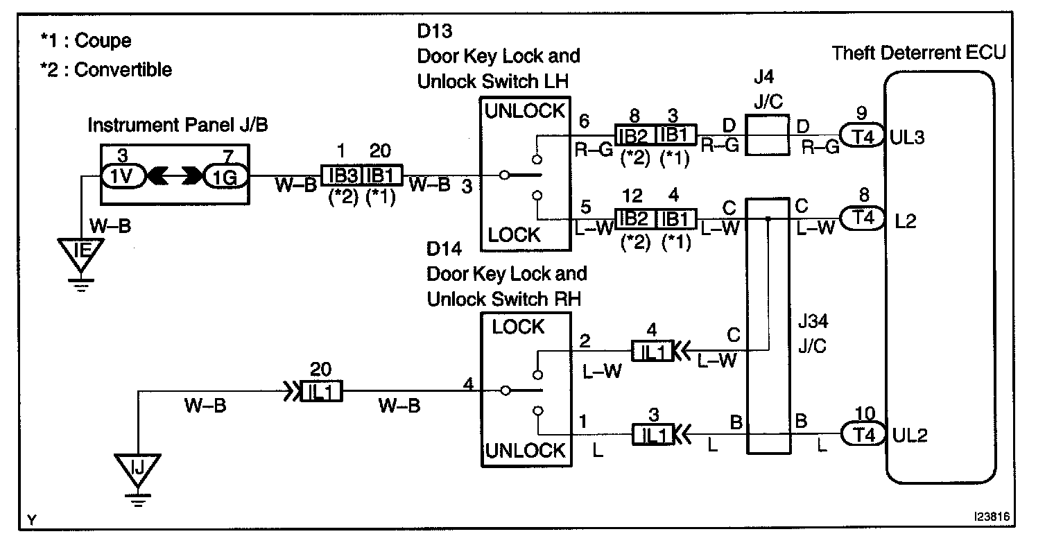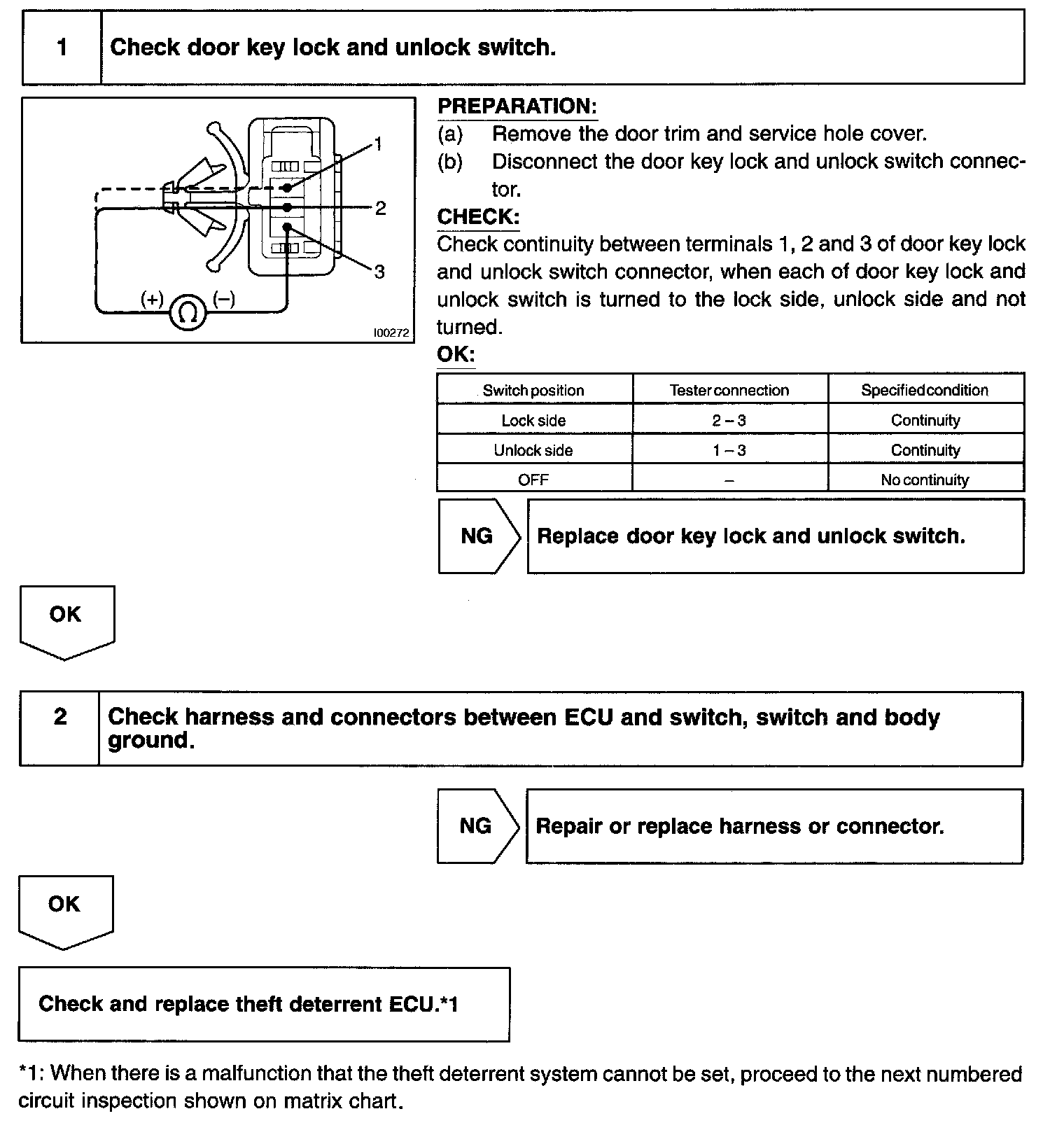 CIRCUIT DESCRIPTIONThe door key lock and unlock switch is built in the door key cylinder. When the key is turned to the lock side, terminal 1 of the switch is grounded and when the key is turned to the unlock side, terminal 2 of the switch is grounded.