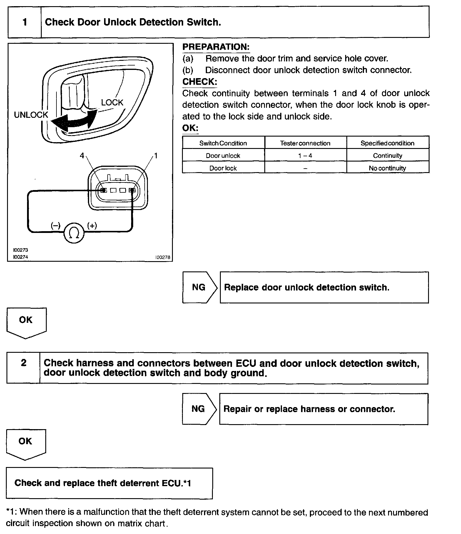 CIRCUIT DESCRIPTIONThe door unlock detection switch is built in the door lock motor assembly. This switch is ON when the door lock knob is in the unlock position and OFF when the lock knob is in the lock position. The ECU detects the door lock knob conditions in this circuit. It is used as one of the operating conditions for the key confinement prevention function.