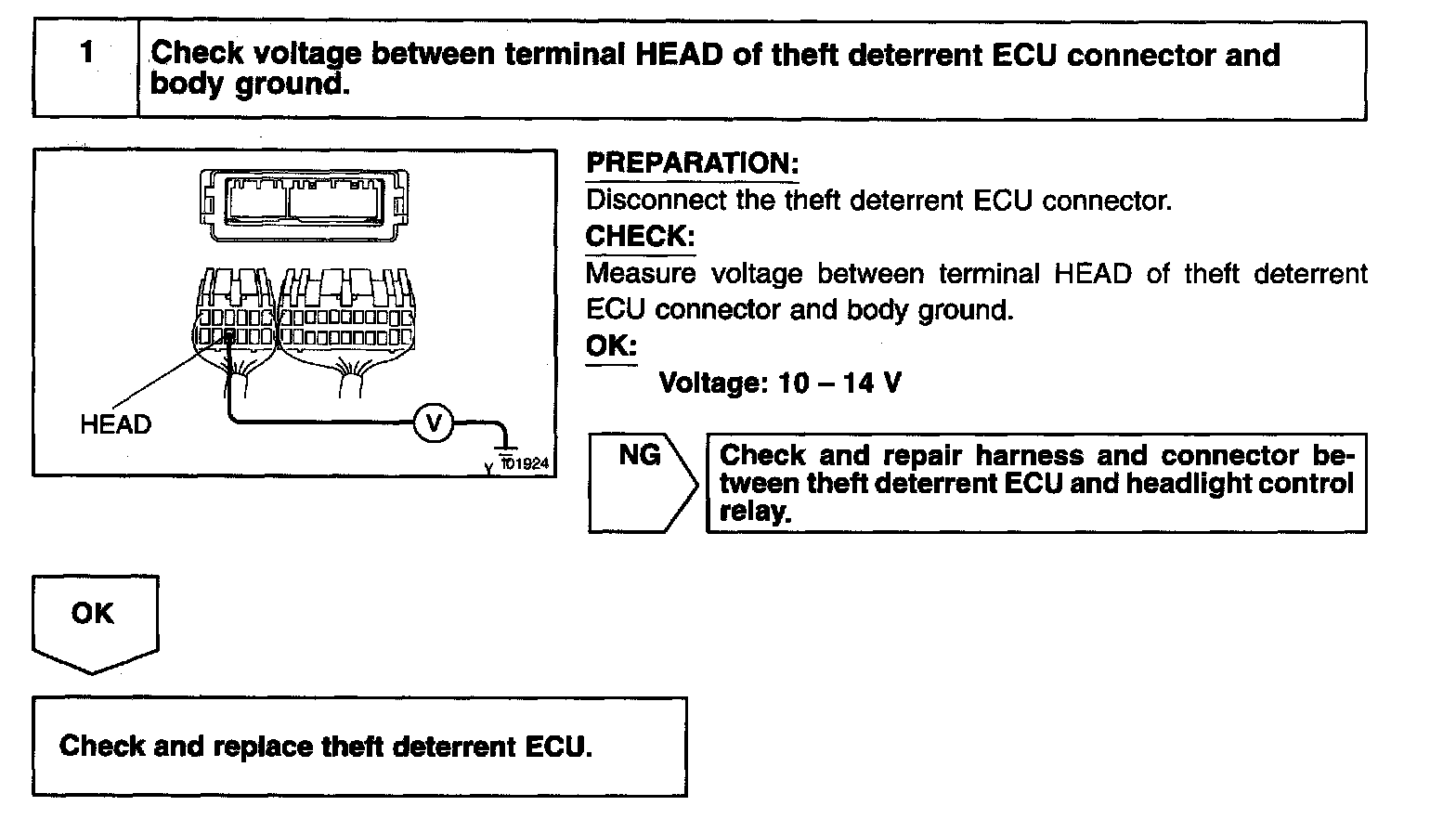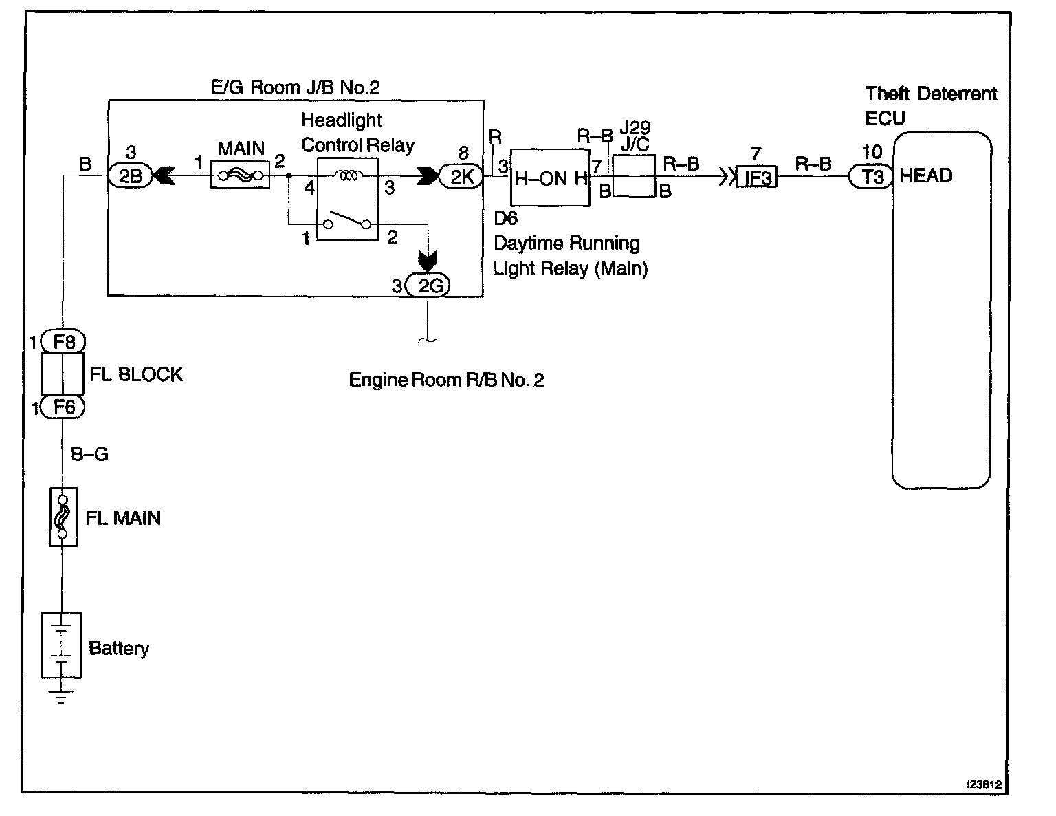 CIRCUIT DESCRIPTIONWhen the theft deterrent system is activated, it causes the Tr in the ECU to switch ON and OFF at approximately 0.4 sec. intervals. This switches the headlight control relay ON and OFF, thus flashing the headlights (See the wiring diagram).