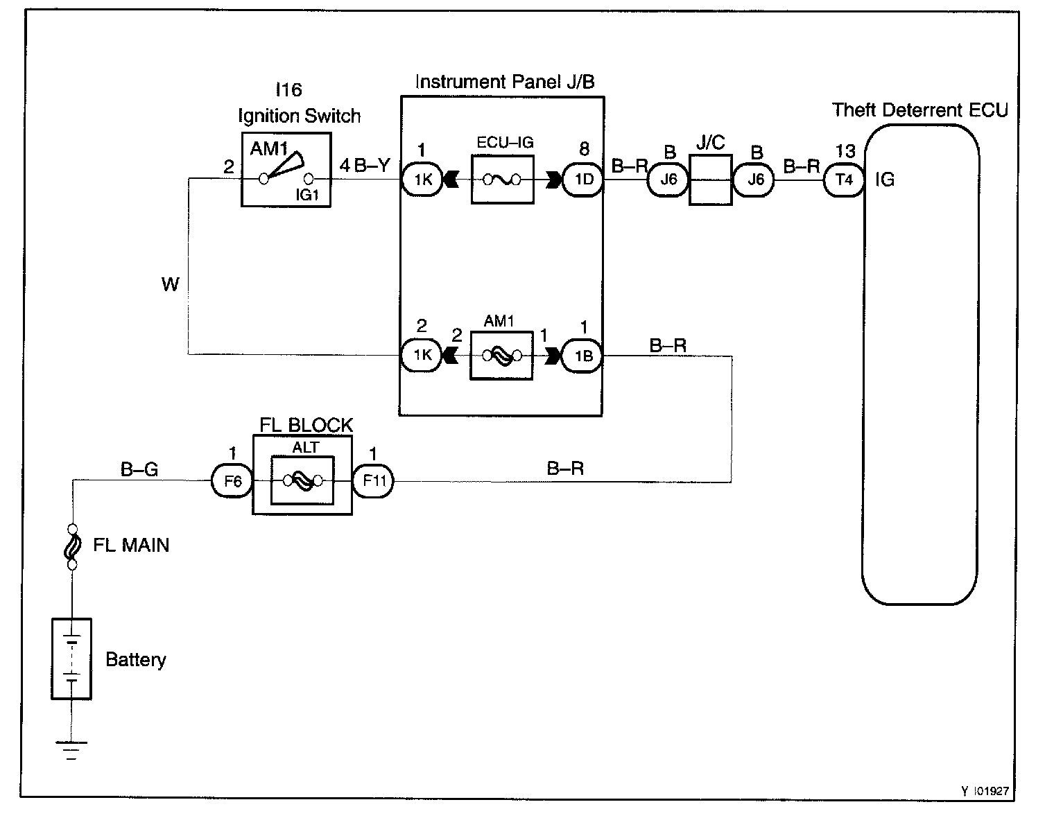 CIRCUIT DESCRIPTIONWhen the ignition switch is turned to the ACC position, battery positive voltage is applied to the terminal ACC of the ECU. Also, if the ignition switch is turned to the ON position, battery positive voltage is applied to the terminals ACC and IG of the ECU. When the battery positive voltage is applied to the terminal ACC of the ECU while the theft deterrent system is activated, the warning stops. Furthermore, power supplied from the terminals ACC and IG of the ECU is used as power for the door courtesy switch, and position switch, etc.