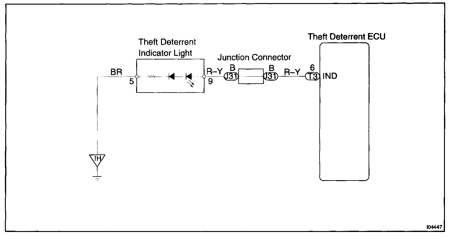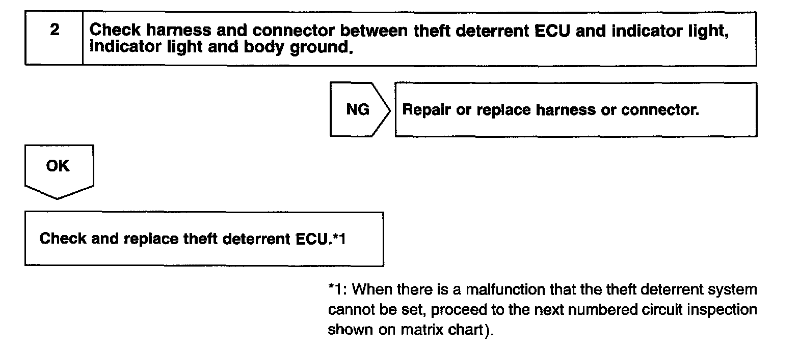 CIRCUIT DESCRIPTIONWhen the theft deterrent system is preparing to set, this circuit lights up the indicator light. When the system has been set, it continuously turns the indicator light on for 0.75 secs. and turns it off for 1.25 secs., thus blinking the indicator light.