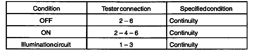 If continuity is not as specified, replace the switch or bulb.