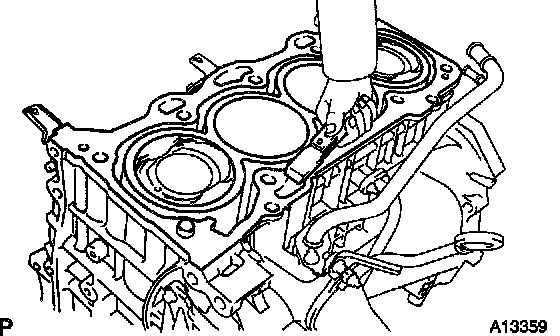 a. Using a gasket scraper, remove all the gasket material from the cylinder block contact surface.