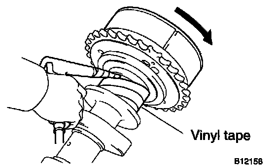 e. Under the condition of (d), turn the VVT timing sprocket to the advance angel side (the arrow marked direction in the illustration) with your hand.