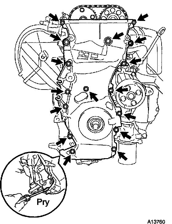 c. Using a screwdriver, pry between the timing chain cover and cylinder head or cylinder block.