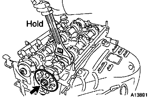 a. Hold the hexagonal head wrench portion of the camshaft with a wrench, and loosen the sprocket bolts.
