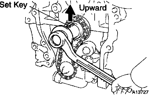 b. Using the crankshaft pulley bolt, turn the crankshaft and set the set key on the crankshaft upward.