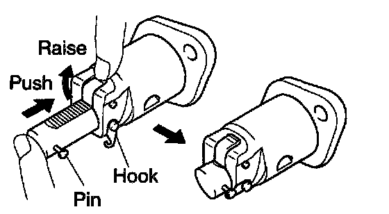 a. Release the ratchet pawl, fully push in the plunger and apply the hook to the pin so that the plunger will not spring out.
